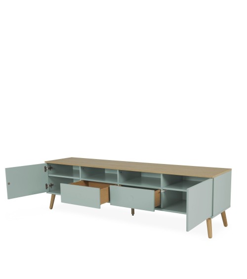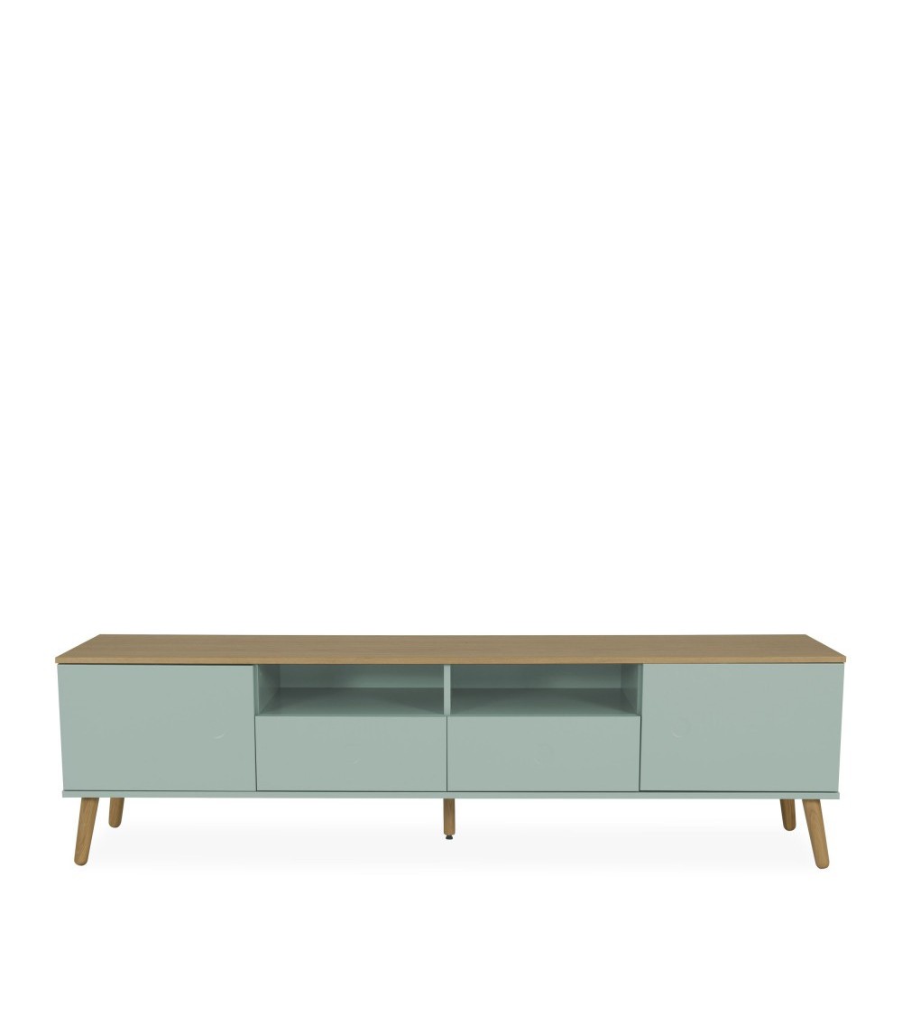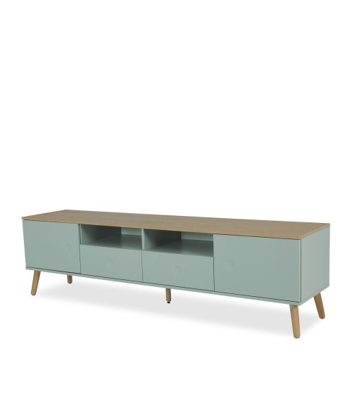 Alliant élégance et praticité, ce modèle est idéal pour se créer un salon cocooning. Le meuble TV Dot en bois 2 portes 2 tiroirs L192 cm de la marque Tenzo adopte un style venu des pays nordiques. Ses lignes droites et épurées sont l'incarnation même de la tendance scandinave. Les pieds compas de ce modèle mettent en valeur son design simple. L'association du bois avec la couleur blanche, grise ou vert d'eau de la façade apporte une touche de dynamisme à tous les styles de décoration d'intérieur. Avec le meuble TV Dot, impossible de manquer de place : il présente sur sa façade 2 portes et 2 tiroirs. Ainsi, ce modèle permet d'organiser au mieux l'emplacement de la télévision, mais également de la box internet, des consoles, des DVD ou des bouquins. Pour accéder au contenu de ces compartiments, il suffit d'exercer une légère pression sur les portes et les tiroirs, qui sont équipés de la fonction push-to-open.En plus de ses 4 pieds en chêne massif, ce meuble TV propose également un pied de support réglable qui renforce sa stabilité. Et pour permettre une utilisation sereine, il est muni d'une protection anti-basculement.