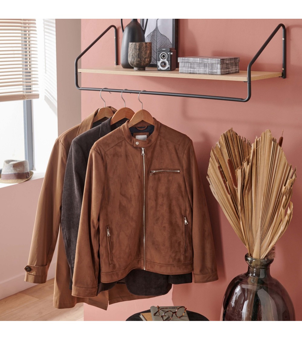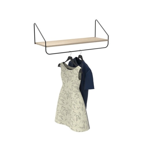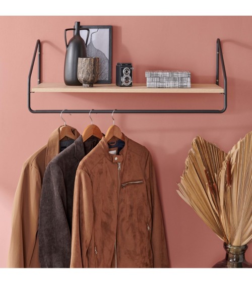 Pratique et esthétique, la penderie étagère murale NELO vous permettra de ranger vos affaires et de suspendre vos vestes et blousons sur des cintres en apportant une touche déco ! L'étagère est fabriquée à partir de panneaux de particules mélaminés (Panneau de particules mélanimé) et se combine parfaitement avec la structure tubulaire en métal noir. Sobre et solide, la tablette murale a été pensée pour offrir un espace de rangement ouvert supplémentaire vous permettant ainsi d'adapter la disposition de vos affaires. Ce mix matière est idéal pour des pièces chaleureuses comme la chambre ou l'entrée. Ce produit existe aussi en blanc ! Cette penderie peut supporter une charge maximale de 10 kg. Vis de fixation murale non fournies.Dimensions : L90 x H30 x P28,5 cm.