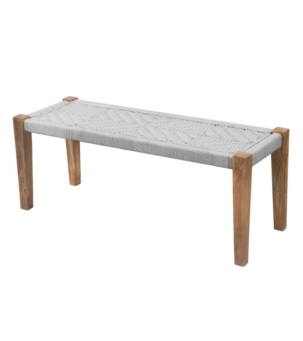 Poids : 8.5kg Dimensions: - Longueur : 117 cm- Profondeur : 40.5 cm- Hauteur : 45.5 cm- Epaisseur de l'assise : 5.5 cmEntretien : Pour un entretien quotidien, utiliser un aspirateur. Nettoyer avec un chiffon doux imbibé d'eau savonneuse. Sécher avec un linge propre. Materiaux : Bois de manguier et corde tisséeMontage : Livré montéInformations : Poids max : 120 kgInformations colis : 124 x 47 x 53 cm