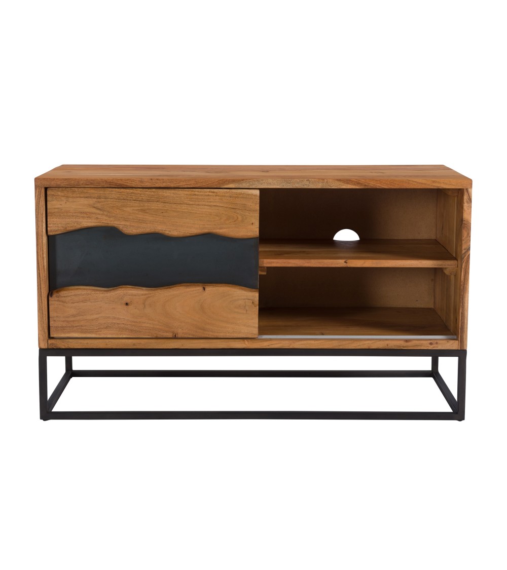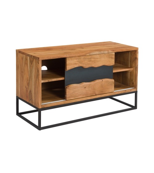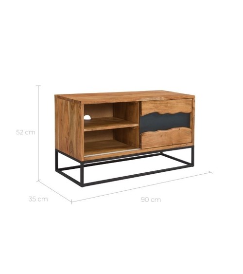 Poids : 28kg Dimensions: - Longueur : 90 cm- Profondeur : 35 cm- Hauteur : 52 cm- Hauteur des pieds : 17 cm- Etagères (x2) : 86 x 14.5 cmEntretien : Frotter avec un chiffon doux imprégné d'eau savonneuse. Sécher tout de suite avec un chiffon propre et sec.Materiaux : Bois d'acacia et métalMontage : Livré montéContenu : 1 porte coulissanteInformations : La couleur de bois utilisé pour la fabrication de ce meuble TV peut varier dun produit à un autre car chaque planche en bois massif est unique et dépend de multiples facteurs pouvant influer sur le coloris final (noeuds, plan de coupe, séchage...).Eviter de positionner le meuble près d'une source de chaleur ou un endroit humide.La couleur du bois se patine avec le temps et l'exposition à la lumière.Poids max : 10 kgInformations colis : 95x40x57 cm