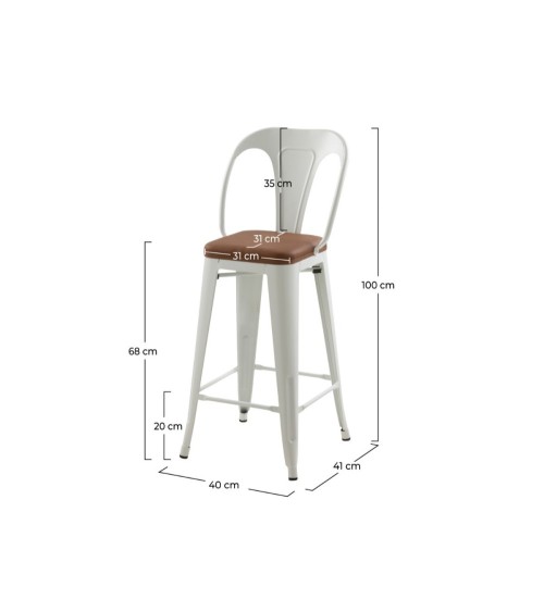 Poids : 5.5kg Dimensions: - Longueur : 45 cm- Profondeur : 42 cm- Hauteur : 100 cm- Hauteur d'assise : 66 cm- Dimension de l'assise : 30 x 30 cm- Hauteur du dossier : 42 cmEntretien : Nettoyer les chaises de bar avec un chiffon imprégné d'un mélange d'eau et de savon.Materiaux : Structure en métalAssise en PUMontage : Pieds à monterNotice incluseContenu : Lot de 2Informations : Finition mateEmpilableMontage nécessaire, notice incluseDensité de la mousse : 24 kg/m3Poids max : 160kgInformations colis : 43 x 43 x 83 cm