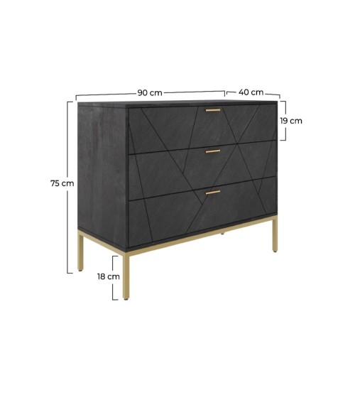 Poids : 34kg Dimensions: - Longueur : 90 cm- Profondeur : 40 cm- Hauteur totale (avec pieds) : 75 cm- Hauteur des pieds : 18 cm- Largeur des pieds : 2 cm- Tiroirs (x3) : 90 x 19 cm- Poignées : 15 cmEntretien : Nettoyer avec un chiffon doux trempé dans un mélange d'eau et de savon. Les produits d'entretien corrosifs sont à proscrire.Materiaux : Manguier et plaquage ardoiseMontage : Pieds à monter, notice incluseContenu : 3 tiroirsInformations : Poids maximum : 16 kgsInformations colis : 97 x 47 x 82 cm