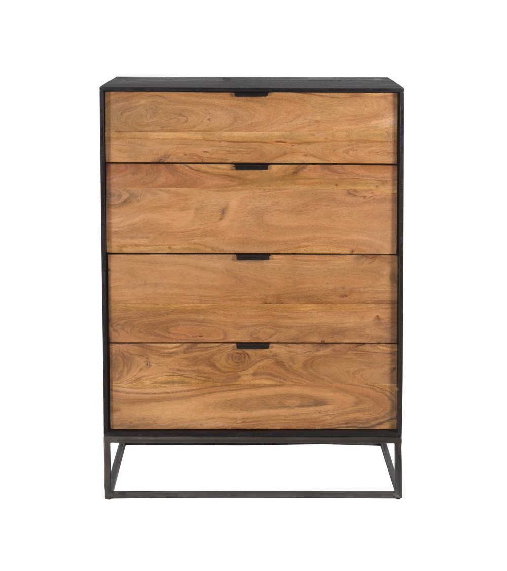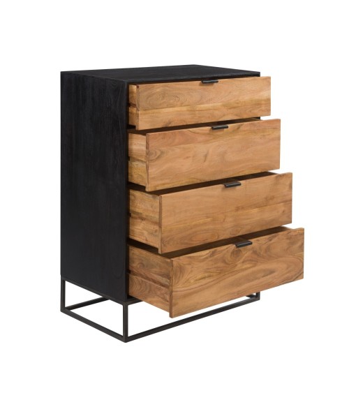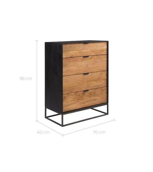 Poids : 44kg Dimensions: - Longueur : 70 cm- Profondeur : 40 cm- Hauteur : 78 cm- Hauteur des pieds : 15 cm- Tiroirs (x3) : 68 x 35 x 20.5 cm- Tiroir (x1) : 68 x 35 x 17 cmEntretien : Frotter avec un chiffon doux imprégné d'eau savonneuse. Sécher tout de suite avec un chiffon propre et sec.Materiaux : Bois d'acacia et pieds en métalMontage : Livrée montéeContenu : 4 tiroirsInformations : La couleur de bois utilisé pour la fabrication de cette commode peut varier dun produit à un autre car chaque planche en bois massif est unique et dépend de multiples facteurs pouvant influer sur le coloris final (noeuds, plan de coupe, séchage...).Eviter de positionner le meuble près d'une source de chaleur ou un endroit humide.La couleur du bois se patine avec le temps et l'exposition à la lumière.Poids max : 15 kgInformations colis : 75x45x103 cm