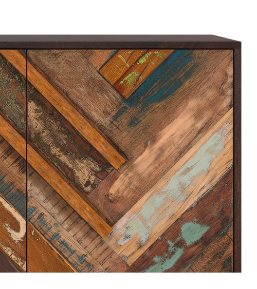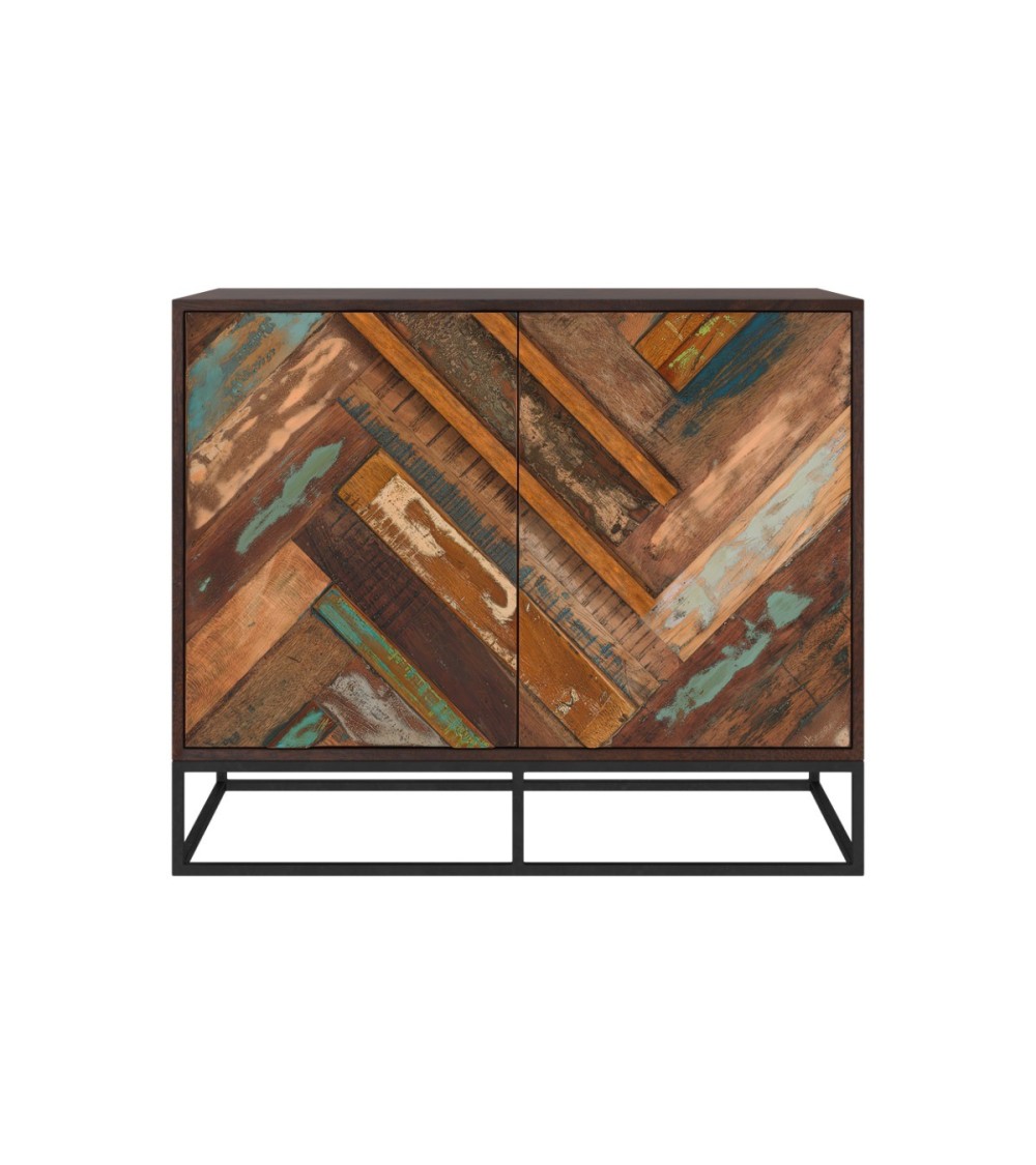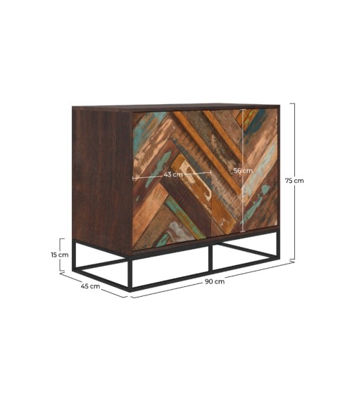 Poids : 46kg Dimensions: - Longueur : 90 cm- Profondeur : 45 cm- Hauteur : 75 cm- Hauteur des pieds : 15 cm- Portes (x2) : 43 x 56 cmEntretien : Frotter avec un chiffon doux imprégné d'eau savonneuse. Sécher tout de suite avec un chiffon propre et sec.Materiaux : Structure en bois d'acacia finition matFaçade en bois recyclé provenant des anciens chemins de fer indiensPeinture fait main sur la façadePiètement en métal Poignées laqué matMontage : Livrée montéeContenu : 2 portes > 2 étagèresInformations : La couleur de bois utilisé pour la fabrication de cette commode peut varier dun produit à un autre car chaque planche en bois massif est unique et dépend de multiples facteurs pouvant influer sur le coloris final (noeuds, plan de coupe, séchage...).Eviter de positionner le meuble près d'une source de chaleur ou un endroit humide.La couleur du bois se patine avec le temps et l'exposition à la lumière.Poids max : 25 kgInformations colis : 97 x 52 x 82 cm