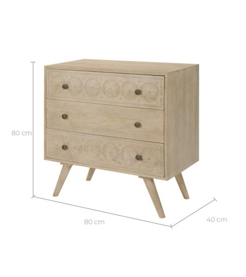 Poids : 33kg Dimensions: - Longueur : 80 cm- Profondeur : 40 cm- Hauteur : 80 cm- Hauteur des pieds : 22 cm- Tiroirs (x3) : 76 x x38 x 18 cmEntretien : Choisir un produit d'entretien dédié ou de l'eau tiède savonneuse à utiliser avec un chiffon doux. Sécher tout de suite avec un linge propre et sec.Materiaux : Bois de manguier et MDFMontage : Pieds à monterNotice incluseContenu : 3 tiroirsInformations : - La couleur de bois utilisé pour la fabrication de cette commode peut varier d'un produit à un autre car chaque planche en bois massif est unique et dépend de multiples facteurs pouvant influer sur le coloris final (noeuds, plan de coupe, séchage...).-Eviter de positionner le meuble près d'une source de chaleur ou un endroit humideInformations colis : 87 x 47 x 67 cm