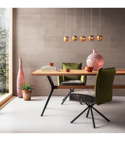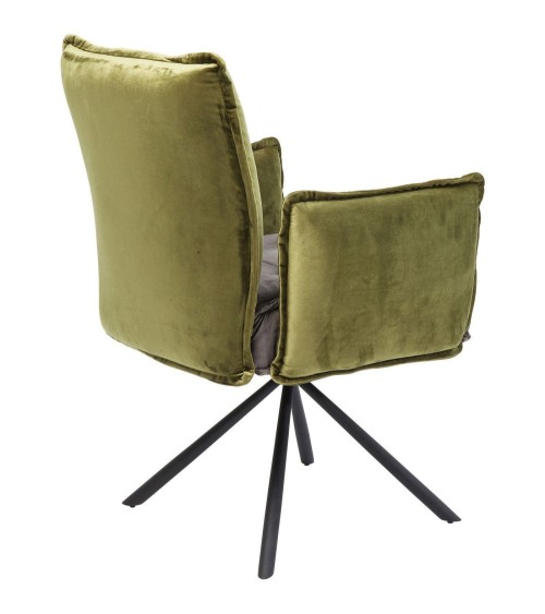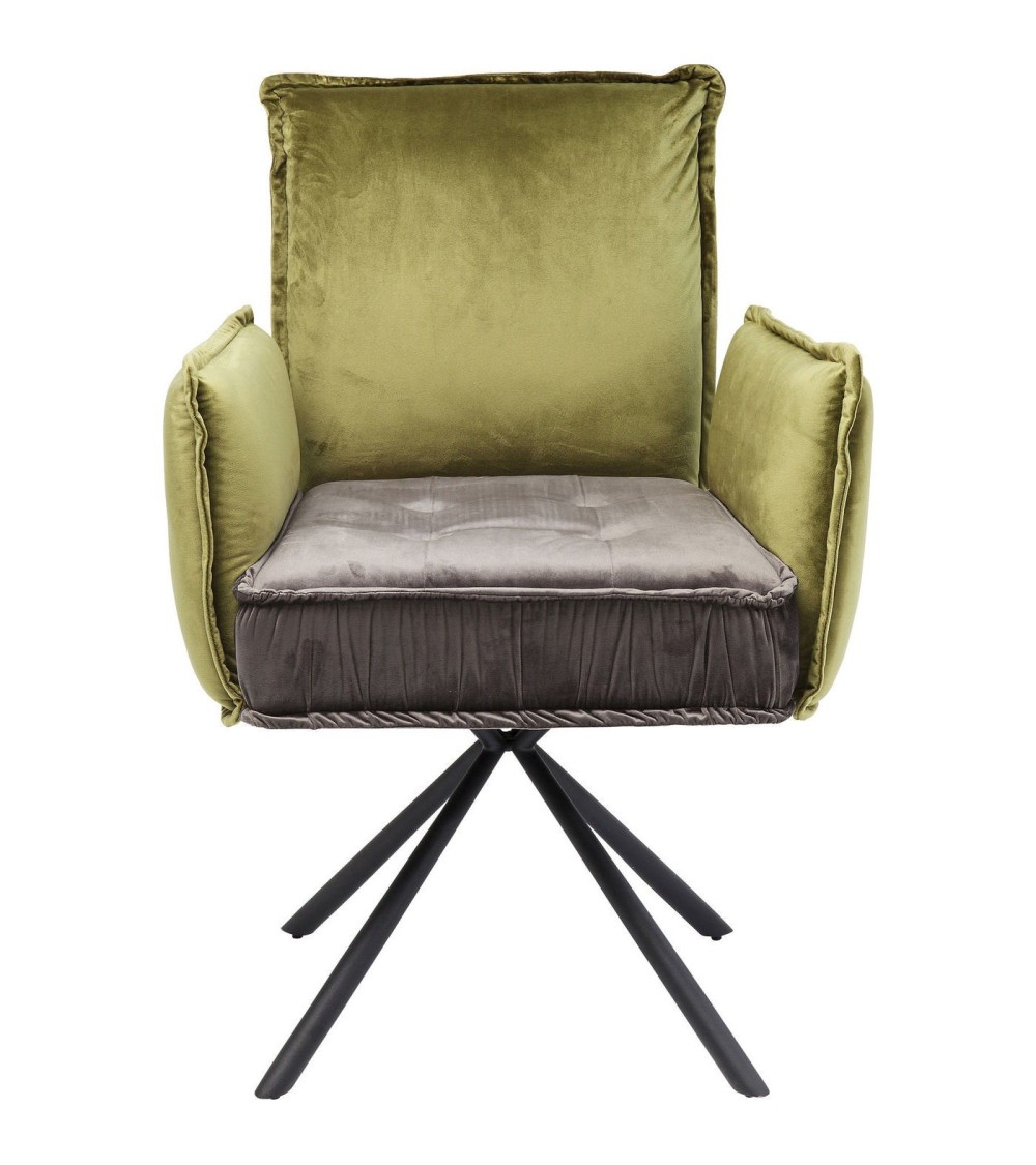 Cette chaise au toucher velours vous offre un confort moelleux avec son siège composé de coussins. Elle présente un contraste entre une assise grise matelassée opposée à un dossier et des accoudoirs verts lisses, le tout supporté par un piétement en pyramide qui lui donne de l'élégance. Cette chaise est aussi disponible en modèle sans accoudoirs. Capacité de charge maximale : 120 kg. Hauteur d'assise : 49 cm. Livrée démontée. Entretien : enlevez les miettes et la poussière avec une brosse douce ou l'aspirateur. Vérifiez que votre produit de nettoyage ne décolore pas le tissu en l'essayant d'abord sur une zone non visible (par exemple sous l'assise).