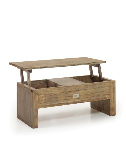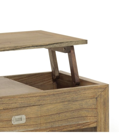 La table basse de la collection MERAPI inclut deux tiroirs et le plateau est relevable. La table parfaite pour la salle de séjour: fait en bois de mindi et poignées en couleur argent.