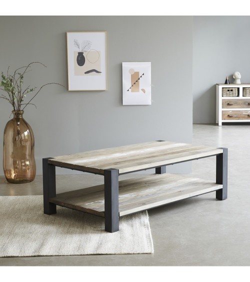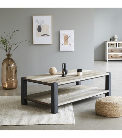 Ligne moderne et mélange de matières, la table basse VINTAGE a tout pour devenir l'atout déco de votre salon. Amoureux du bois brut, vous allez adoré. Fan de l'esprit factory, vous allez succombé ! Les pieds en métal de cette table basse sont surmontés par un épais plateau en pin, le tout patiné pour une finition brute et authentique. Le second plateau permettra de ranger magazines et télécommandes. Caractéristiques : Matière : Pin recyclé et métal - Couleur : Bois naturel et gris - Hauteur : 45 cm - Longueur : 140 cm - Largeur : 80 cm - Poids : 43 kg - Garantie : 2 ans - Montage : Livrée montée. Les + : effet used 1 double plateau - Style industriel.