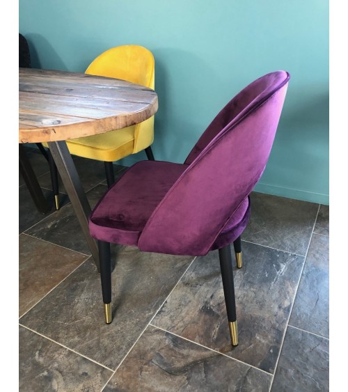Chaise de repas dans le style Art Déco en velours prune. Décorez votre salle à manger avec cette assise confortable et tendance avec son revêtement velours, dans un style classique chic. Ses pieds sont en acier noir mat avec une finition laiton aux extrémités. La chaise Ardec est également disponible en jaune, orange et bleu, mettez de la couleur dans votre intérieur