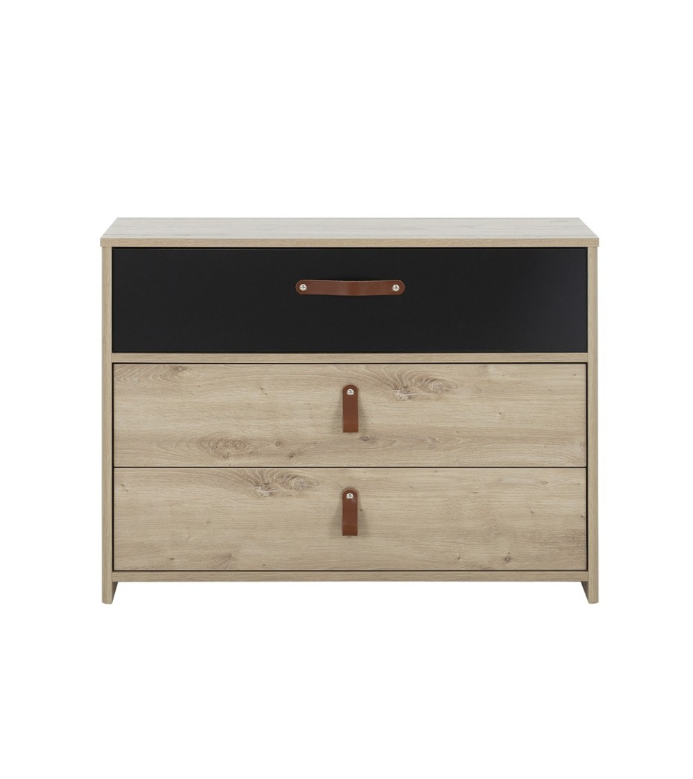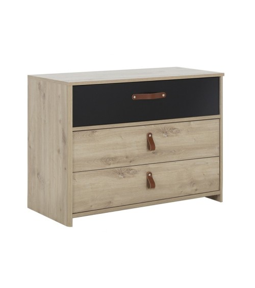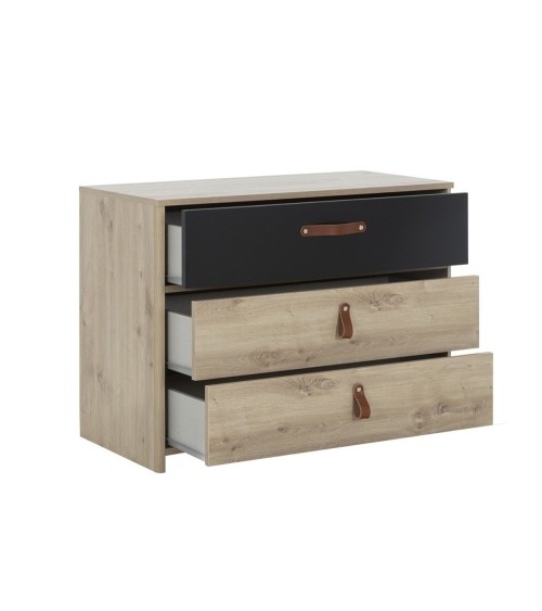 Découvrez cette Commode 3 tiroirs style industriel couleur chêne artisan, qui trouvera sa place dans votre chambre près de tous vos autres meubles.Pratique, cette commode bénéficie de 3 grands tiroirs, idéals pour ranger vos vêtements à porter de mains. Ces tiroirs sont tous trois équipés de poignées en cuir enrobé.Vous pouvez associer cette commode à la coiffeuse ou la table de chevet de la même collection.Cette commode avec 3 tiroirs dispose d'une profondeur de 45cm pour maximiser la place disponible dans les tiroirs.Matière : Panneaux de particules 100% origine France, et issus de forêts durables (label PEFC).Dimensions : 85 cm x 68 x 41 cmPoids : 28.3 kgAutres caractéristiques : meuble à monter soi même. Garantie 2 ans, livré sous 10 jours.
