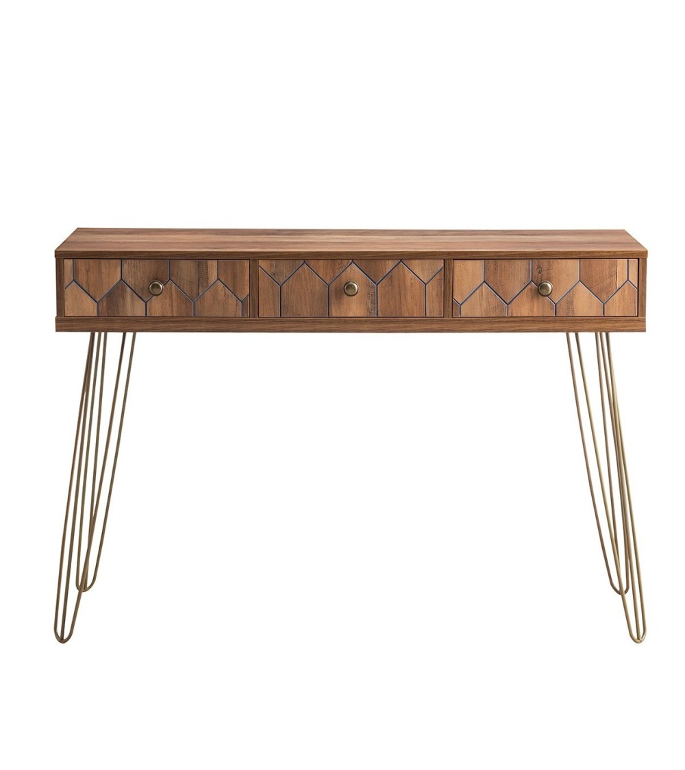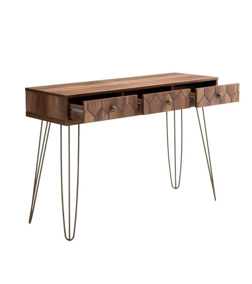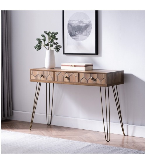 Découvrez notre console trois tiroirs avec pieds métalliques Lea avec sa sérigraphie graphique, sa couleur bois et son piétement métallique couleur bronze. Elle vous apportera une ambiance tendance et chaleureuse à votre intérieur. La console trois tiroirs avec pieds métalliques Léa dispose d'une structure en panneaux de particules et MDF épaisseur 15 mm. Elle est composée d'un piétement métal couleur bronze et 3 tiroirs coulissants. Vous pourrez décorer votre intérieur avec vos objets de décoration préférés ou y déposer vos accessoires du quotidien. Caractéristiques de la console d'entrée à 3 tiroirs : Matériaux : Panneaux de particules. Dimensions : L 115 x P 39 x H 79.5 cm. Poids net : 25 kg. Cet article est livré en 2 colis.