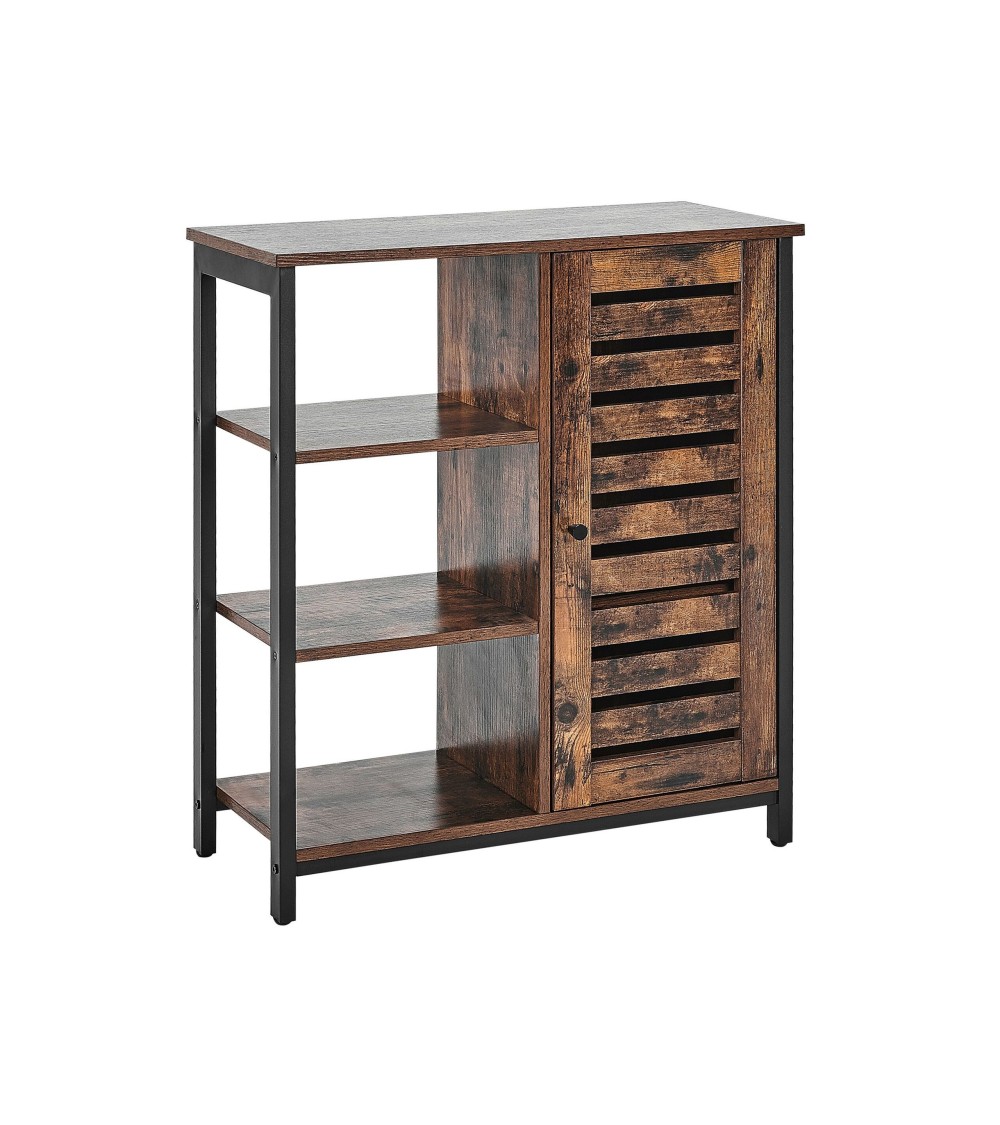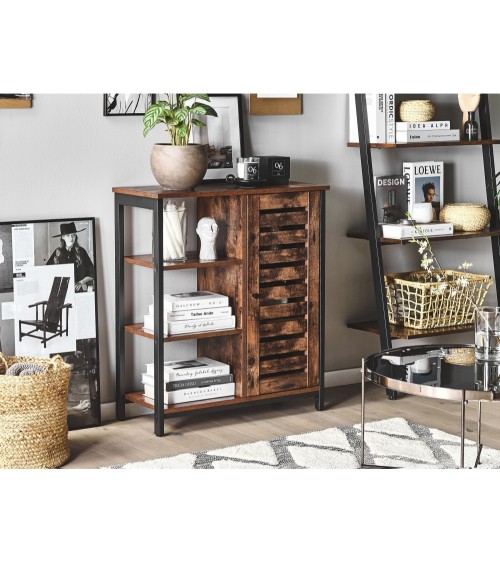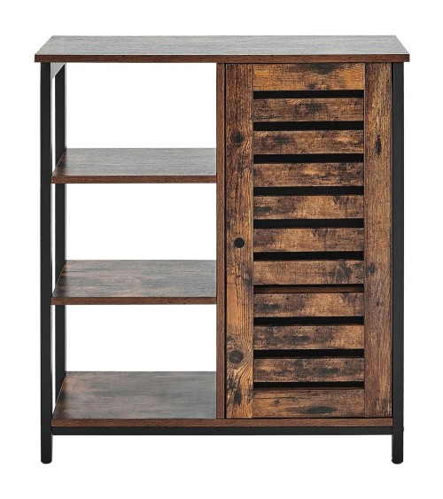 Organisez vos documents, magazines et bibelots en accord avec les dernières tendances déco. Cette petite commode effet bois foncé avec structure en métal noir est une fière représentante du style industriel assaisonné d'une touche rustique. Idéale pour compléter le décor de la plupart des salons, chambres ou couloirs modernes, elle offre beaucoup despace de rangement sans encombrer votre intérieur. Doté d'un compartiment à porte et de 3 étagères ouvertes, ce joli buffet peut servir de lieu supplémentaire pour exposer vos livres ou objets décoratifs. Une commode de style et un meuble de rangement que vous allez apprécier.