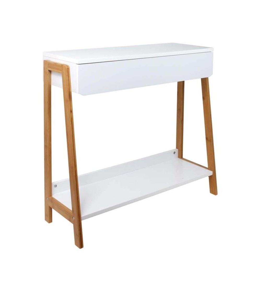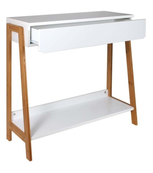 Aspect : Coloris : BlancMatériau principal : MDFMatériaux secondaires : BambouDimensions : Hauteur (en cm) : 77Longueur (en cm) : 83,80Profondeur (en cm) : 34Autres caractéristiques : Informations complémentaires : Tiroir intégréPoids (en kg) : 14,35 Console scandinave en bois avec tiroir Ida