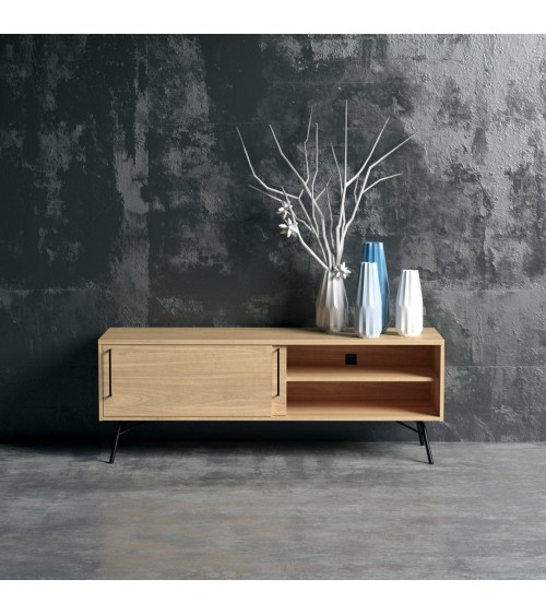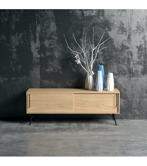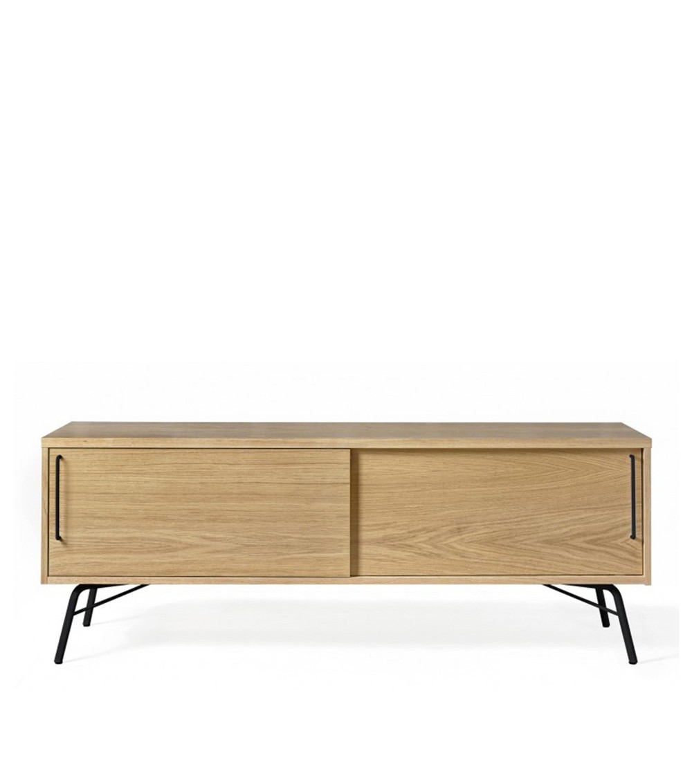 On aime le design rétro/design de ce meuble Ashburn made in Europe et son joli contraste bois/métal très tendance. Il dispose de 2 portes coulissantes en chêne plaqué qui renferment 4 niches de rangement, pouvant accueillir des consoles de jeux, lecteurs DVD, périphériques, câbles... Il est aussi doté de passe-câbles pour une utilisation encore plus pratique de tous les appareils. Une fois fermées, les portes ont l'avantage d'offrir une façade design aux lignes épurées et élégantes. Ce meuble peut très bien servir de buffet ou de simple meuble de rangement dans un séjour à la déco vintage, une chambre ou un bureau ! Dans tous les cas, il apportera une touche très classe au reste de la pièce. Une création de l'éditeur estonien Woodman. Caractéristiques : Marque : WoodmanCouleurs : Bois et piètement + poignées jaune ou blanc Structure : Chêne naturel plaquéLes étagères sont ajustables sur 3 niveaux à l'intérieur du meuble Pieds : Métal peint Dimensions (LxPxH) : 145 x 44m x 53 cmPoids net : 13 kg Hauteur des pieds : env. 20cm Dimensions de l'emballage (LxPxH) : 152 x 41 x 41 cm Poids : 15 kgOrigine : UE / Estonie