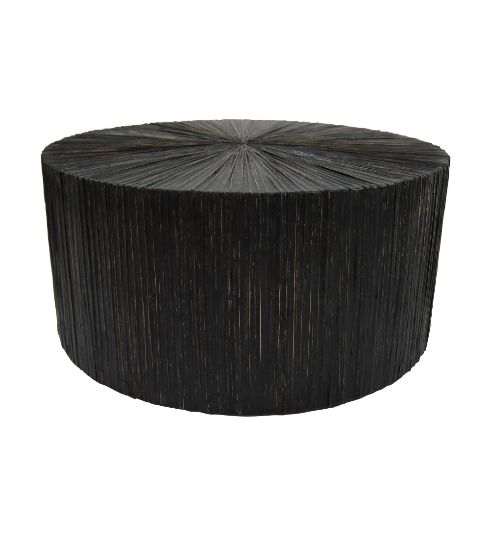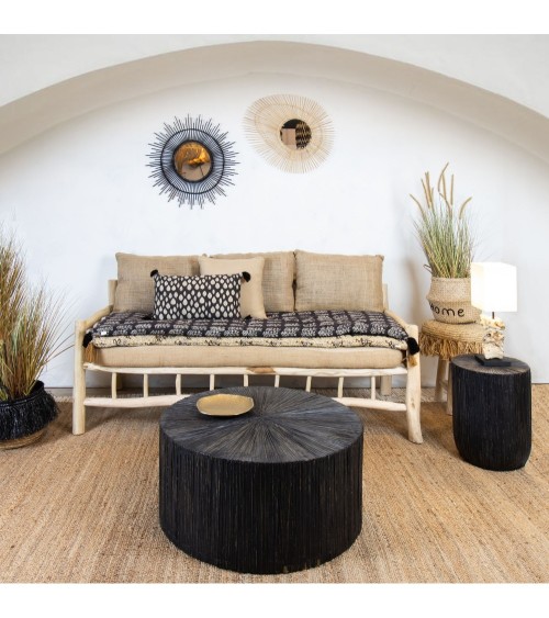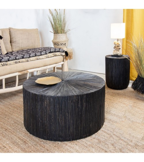 Esprit voyage, cette table basse strié fabriquée à la main en bois et feuilles de cocotier peinte en noir permettra de créer une ambiance ethnique et originale. Matières : Bois et feuilles de cocotier Dimension : Ø75cm, Ht 35CM Fabriquée à la main Poids : 7.520 kgs Utiliser un chiffon humide
