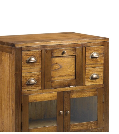 Meuble de salle de bain de style colonial de la collection star, fabriqué à la main en bois mindi et une structure solide. Il dispose de 4 tiroirs et de deux portes vitrées, ainsi que dune porte abattante dans la partie centrale supérieure, parfait pour ranger les accessoires de salle de bain. Comprends des poignées en bronze. Aucun assemblage requis.