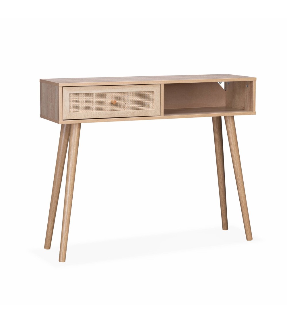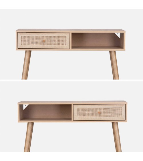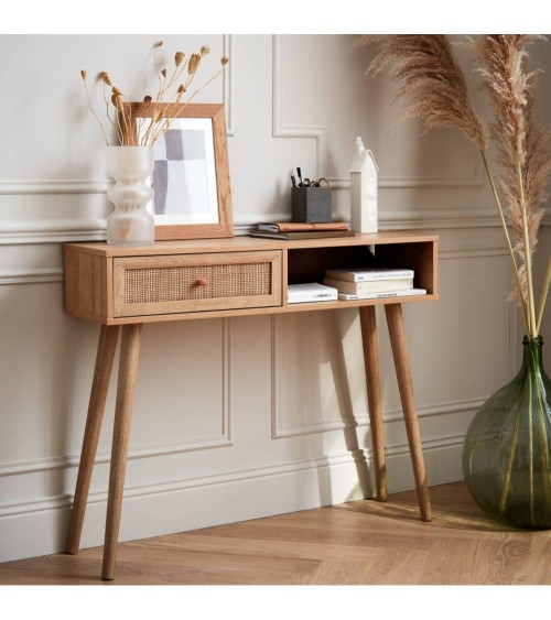 Console en cannage - BohèmeLes + produitDotée d'un tiroir et d'une nichePieds compasPiètement en bois Notre collection Bohème a été pensée pour donner une touche naturelle et vintage à votre intérieur avec des meubles en cannage. Le caractère du décor bois se marie parfaitement avec la simplicité du cannage qui habille les meubles avec élégance. Table basse, meuble de TV, table de chevet... Cette collection vous propose une sélection de meubles de rangement pour aménager votre intérieur tout en légèreté. Une console à l'esprit bohème Placée dans un couloir ou dans un salon, cette console apporte du cachet à votre intérieur. Avec ses lignes droites et son tiroir en cannage, elle est élégante et indémodable. Cette console peut aussi être utilisée comme coiffeuse dans une chambre, il suffira de lui ajouter un joli miroir. Un meuble d'appoint pratique Ce meuble d'appoint offre un espace de rangement supplémentaire tout en étant du plus bel effet chez vous. Sur son plateau, vous pourrez placer vos objets décoratifs comme des vases, des bougeoirs ou une lampe. Le tiroir et la niche permettent de ranger les objets du quotidien (gants, foulards, clé) que vous souhaitez garder à portée de main. Le tiroir peut être placé à droite ou à gauche en fonction de vos envies. Les pieds solides garantissent stabilité et durabilité.