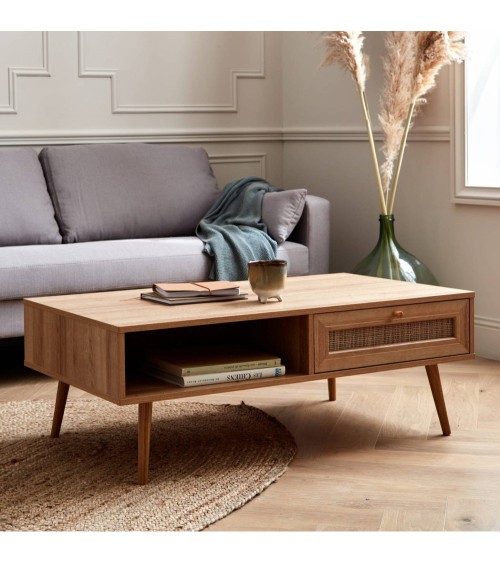 Table basse en cannage - Bohème Les + produit 1 tiroir en cannage1 espace de rangement ouvert Pieds compas en boisTiroir réversible Notre collection Bohème a été pensée pour donner une touche naturelle et vintage à votre intérieur avec des meubles en cannage. Le caractère du décor bois se marie parfaitement avec la simplicité du cannage qui habille les meubles avec élégance. Table basse, meuble de TV, table de chevet... Cette collection vous propose une sélection de meubles de rangement pour aménager votre intérieur tout en légèreté. Une table basse au centre de votre salon La table basse Bohème est idéale pour tous vos moments conviviaux. Apéritif improvisé entre amis ou café en famille, cette table basse trouvera parfaitement sa place au centre de votre salon. Elle est dotée d'un espace de rangement pour glisser des livres et magazines et d'un tiroir très pratique pour ranger vos affaires comme les télécommandes. Un design bohème et élégantLa structure de la table Bohème est en décor bois. Il lui confère un design naturel et authentique. Son tiroir en cannage et ses pieds compas scandinaves donnent une touche rétro et élégante à l'ensemble. Pratique, le tiroir est réversible, vous pouvez donc choisir le côté où vous souhaitez le placer.