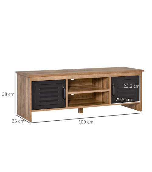 Ce magnifique meuble TV design industriel sublimera votre intérieur. Mélant avec élégance niches et placards avec portes métal, ce banc TV rajoutera une touche supplémentaire d'élégance à votre intérieur et vous offrira des espaces de rangement pour accueillir votre télévision, matériel audio et vidéo.Caractéristiques :- Meuble TV design industriel mélant avec élégance aspect bois avec veinage et métal noir- Banc TV qui ajoutera une touche type loft New-Yorkais à votre intérieur- 5 espaces de rangement disponibles : 2 niches, 2 placards, grand plateau- Excellent niveau de finition : portes dotées de petites grilles d'aération et poignées coudées noires, 2 passe-fils intégrés, meuble sur pied- Conception et fabrication de qualité en panneaux de particules robustes E1 et métal (portes placards)- Montage facile et rapide (manuel d'assemblage illustré fourni)Spécifications :- Couleurs : aspect bois avec veinage brun, noir- Matériaux principaux : panneaux de particules classe E1, métal- Dim. totales : 109L x 35l x 38H cm- Dim. rangements internes placards : 30L x 32l x 24H cm- Dim. niches : 39,5L x 33,5l x 9,5/12,5H (de haut en bas)- Ø passe-fils : 6 cm- Hauteur pieds : 8 cm- Charge max. recommandée totale : 40 Kg- Livraison effectuée en un colis- Réf. : 839-064BK