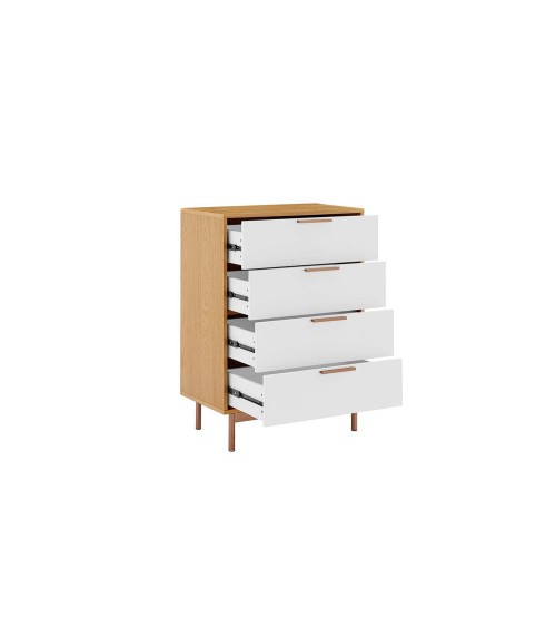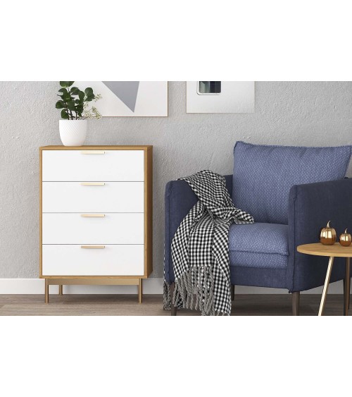 Craquez pour cette belle commode aux allures scandinaves et chics. Son design épuré et ses finitions rose gold donnera une touche de modernité à votre intérieur que ce soit dans votre salon ou dans votre chambre. La commode est composée de 4 grands tiroirs qui vous permettront de ranger pas mal d'affaires que ce soit de la vaisselle ou encore des vêtements. Elle s'intégrera donc parfaitement à tous les styles d'intérieurs grâce à ses tons neutres.Caractéristiques techniques :Couleur principale : Blanc matCouleur secondaire : Bois naturelPiètement : Métal finition rose goldPoignées : Métal finition rose goldMatériel : Panneaux MDF et pieds en métalRangement : 4 tiroirsEntretien :Nettoyage facile à laide dun chiffon humide.Dimensions :Dimension totale : 69,6 x 39,6 x 75,8 cmDimensions des pieds : 63 x 38,5 x 15 cmDimensions des tiroirs : 51,2 x 33,4 x 11,3 cmConditionnement :Le produit est conditionné dans 2 colis 67 x 19 x 12 cm / 25 kgs86 x 28 x 21 cm / 15 kgsMontage facile une notice est fournieLivraison pas de porteGarantie 2 ans