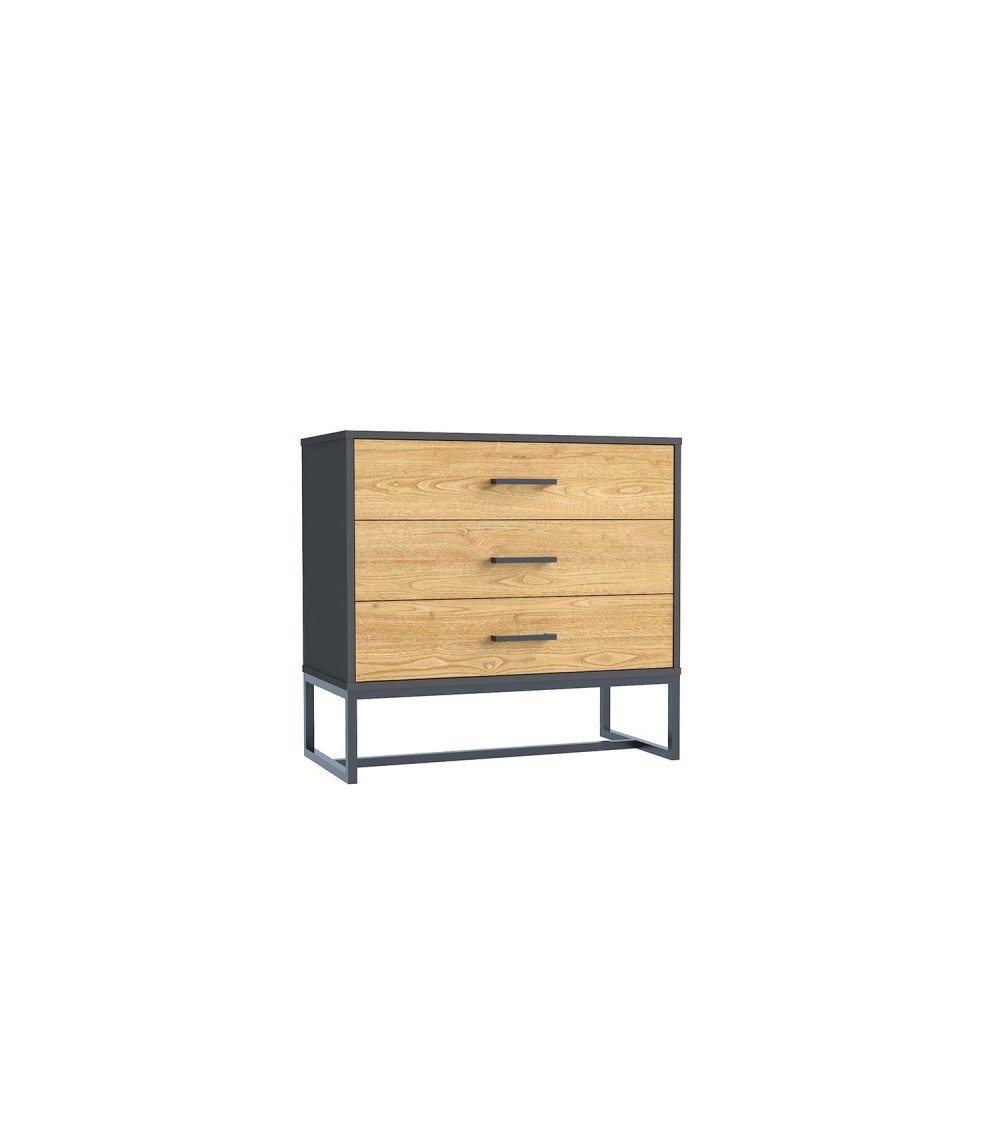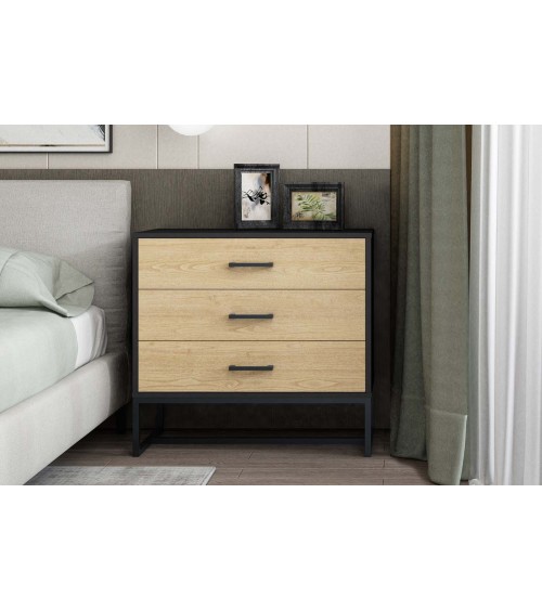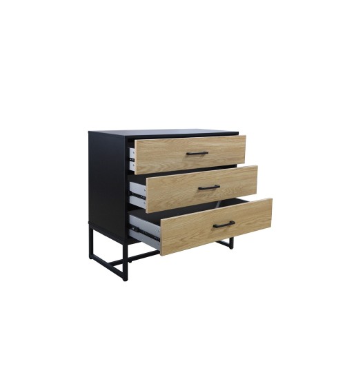 Découvrez cette commode au style industriel avec ses 3 grands tiroirs. Son design industriel avec le mélange du bois et des finitions en métal noir apporteront une touche de modernité à votre intérieur. Besoin de rangements dans votre chambre ? Cette commode répondra parfaitement à vos attentes grâce à ses tiroirs très spacieux qui vous permettront de ranger une grande partie de vos vêtements. Vous n'aurez plus d'excuses pour laisser trainer vos affaires.Caractéristiques techniques :Couleur principale : Noir matCouleur secondaire : Bois naturelPiètement : Métal noirMatériel : Panneaux MDF et pieds en métalRangement : 3 tiroirsEntretien :Nettoyage facile à laide dun chiffon humide.Dimensions :Dimension totale : 80 x 40 x 74,8 cmDimensions des pieds : 90 x 20 x 129,4 cmDimensions des tiroirs : 61,2 x 33,4 x 11,3 cm Conditionnement :Le produit est conditionné dans 2 colis 43 x 23 x 13 cm 89 x 49 x 17 cmMontage facile une notice est fournieLivraison pas de porteGarantie 2 ans