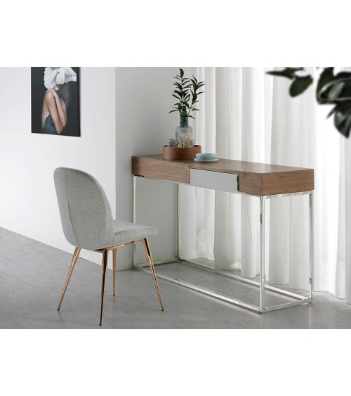 Produit à usages professionnels et particuliers. Console en noyer et acier modèle 3111 Angel Cerdá S.L. Console au design moderne avec plateau rectangulaire en placage de noyer naturel de 0,5 mm d'épaisseur. Sa structure originale de pieds en acier inoxydable chromé 21 microns est l'un des éléments clés à souligner dans son design. Une console parfaite pour apporter de la lumière et de l'avant-garde à votre entrée ou hall, ainsi que pour tout garder en ordre grâce à son tiroir latéral avec système d'ouverture par poussée et fermeture en douceur avec une façade finie en acier inoxydable chromé 21 microns. STYLE: Cette console originale apportera la touche moderne et différente que vous recherchez dans votre maison. Une pièce exclusive idéale à combiner avec les dernières tendances de la décoration. MULTI USAGE: Polyvalente et fonctionnelle, sa conception lui permet de s'intégrer dans n'importe quel hall, couloir ou pièce. DÉCORATION ET CONFORT: Le bois de noyer combiné avec l'acier inoxydable chromé, apporte chaleur et élégance à l'environnement, résultant en un espace confortable et moderne. FONCTIONNALITÉ: Tant pour son design que pour son tiroir latéral à ouverture par poussée et système de fermeture en douceur, cette console est parfaite pour créer des environnements spacieux et chaleureux, tout en gardant tout à sa place. GAMME PROFESSIONNELLE : A destination des architectes d'interieur, Bureaux, Commerces et événementiel, Hôtellerie, Restauration.