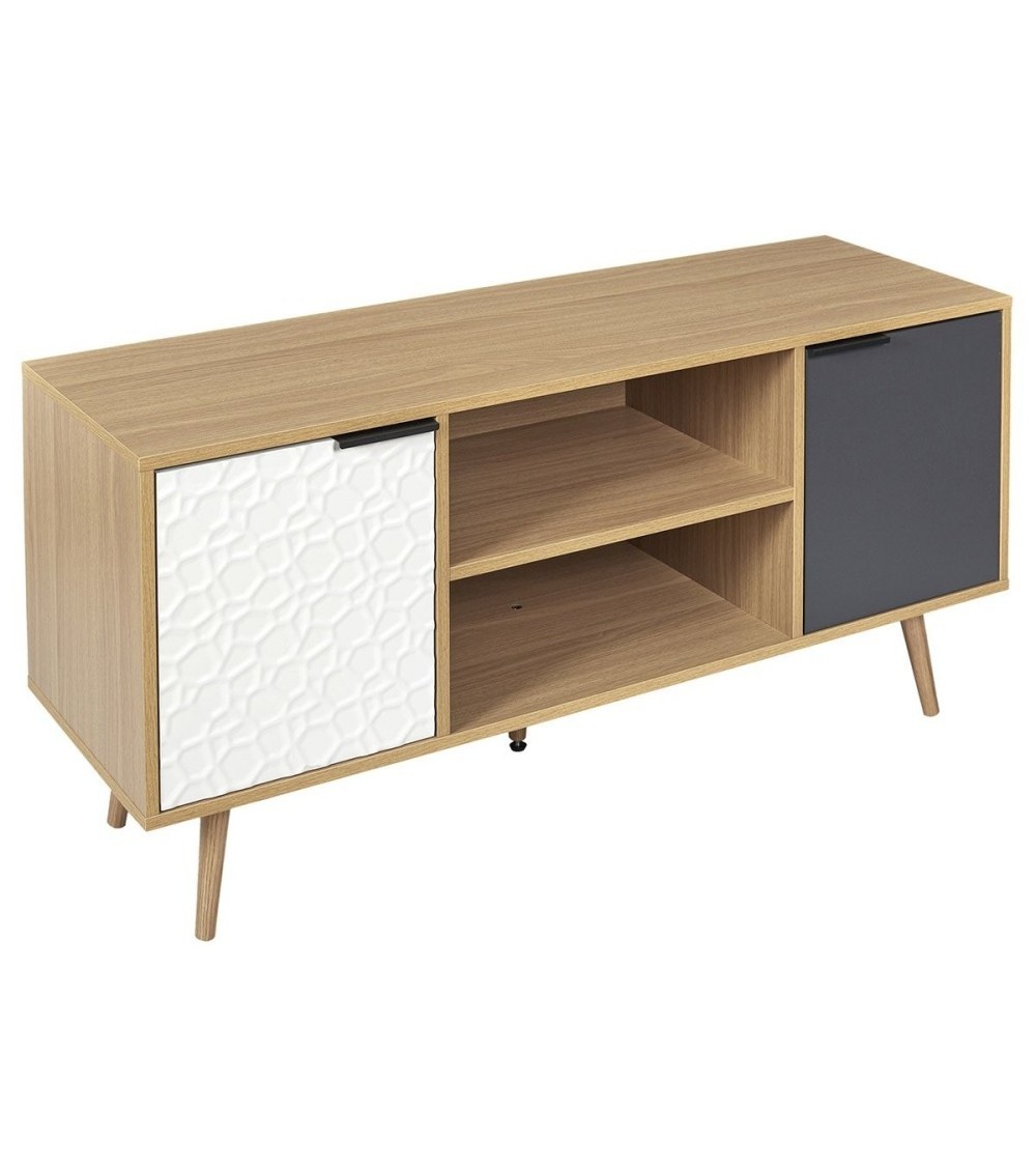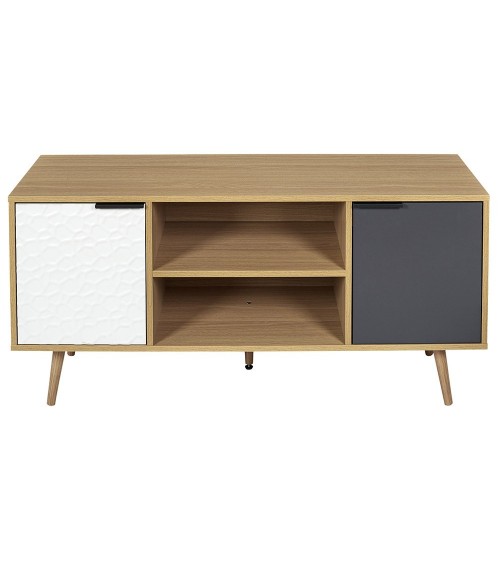 Découvrez ce superbe meuble TV Sven couleur bois naturel, blanc et gris qui prendra place dans votre salon au style contemporain ou scandinave. Ce meuble TV avec ses 4 cases dont 2 avec portes possède 5 pieds pour plus de robustesse et de stabilité.Informations sur le meuble TV Sven :Dimensions : L. 120 x l. 39 x H. 56,30 cmMatières : bois, contre-plaquéPoids du meuble : 21 kgA monter soi-même