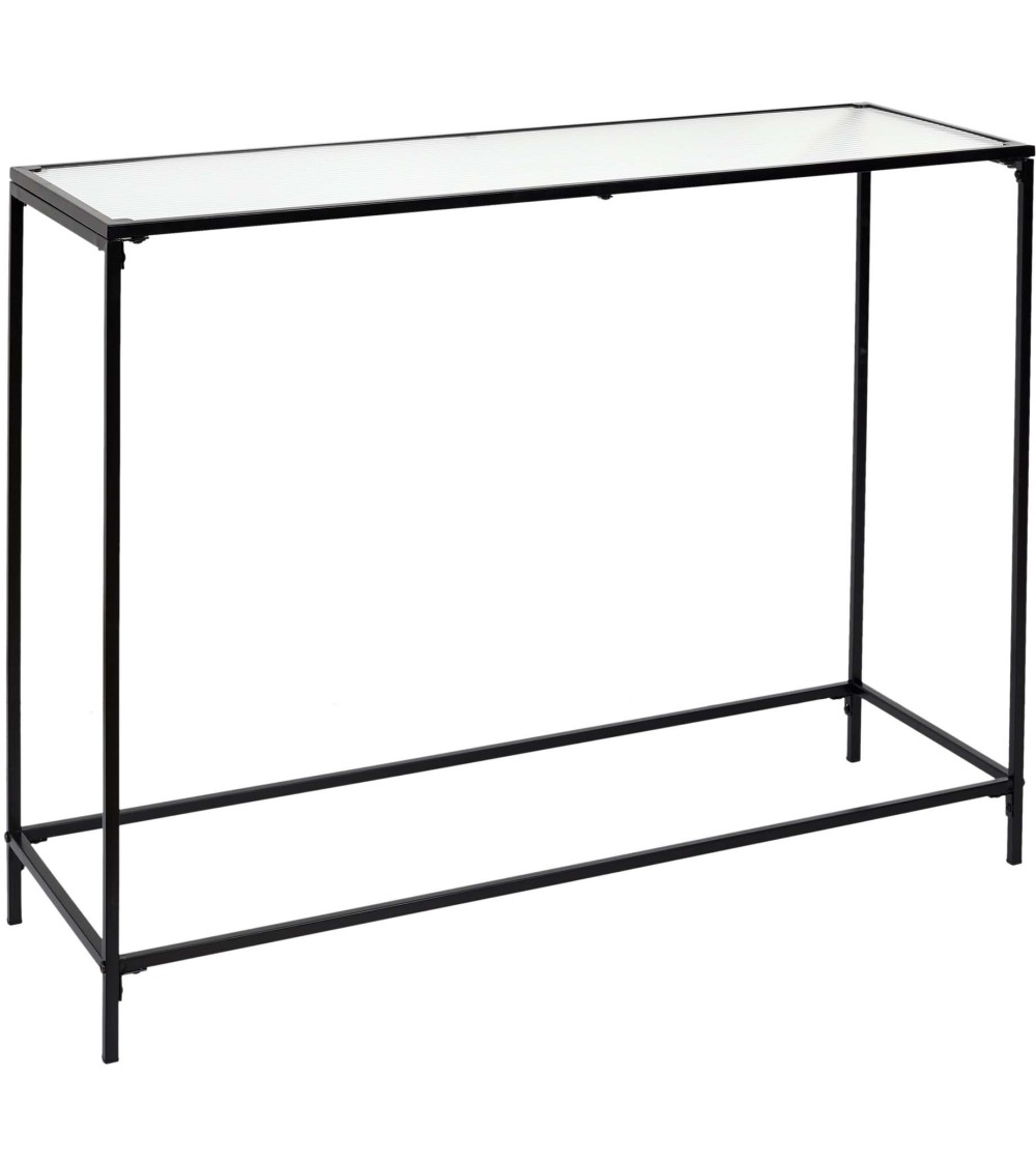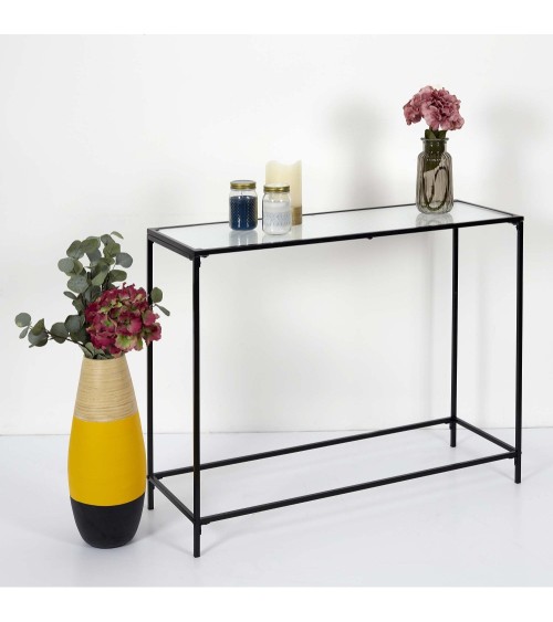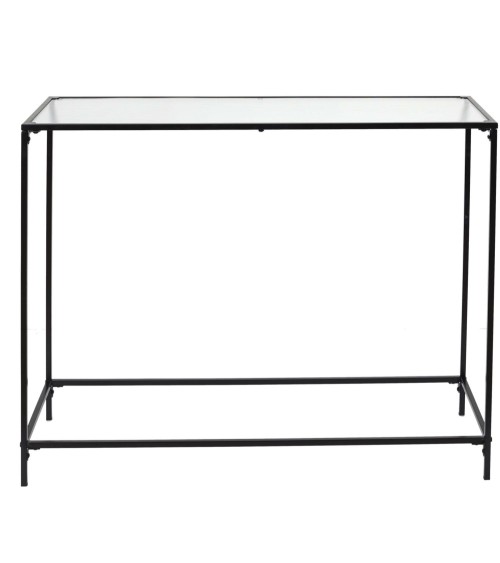 Aspect : Coloris : NoirMatériau principal : FerMatériaux secondaires : Verre trempéDimensions : Hauteur (en cm) : 77Longueur (en cm) : 100Profondeur (en cm) : 35Autres caractéristiques : Poids (en kg) : 5,50 Console plateau en verre texturé Rosa