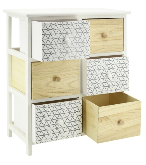 Aspect : Finitions : Teintée blancMatériau principal : BoisDimensions : Hauteur (en cm) : 64,00Longueur (en cm) : 54,00Profondeur (en cm) : 29,00Autres caractéristiques : Livré monté : OuiPoids (en kg) : 7,70 La blanc et le naturel s'associent pour créer une ambiance sobre et moderne à la fois. La commode en bois 6 tiroirs confirme son efficacité comme meuble de rangement.