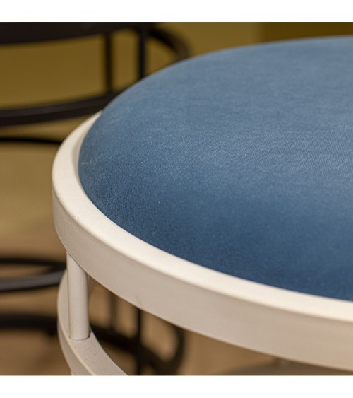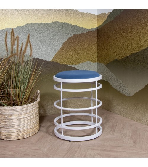 Tout le charme de ce tabouret TOMMY en métal blanc et velours bleu, réside dans ces formes arrondies contemporaines et modernes. Sa structure en métal assure une solidité sans faille. Avec son assise en velours, il apportera un coté chaleureux dans la pièce de votre choix. Description : Tabouret en velours bleu avec pieds en forme de cercles en métal blanc. Livré monté. Confort : Garnissage assise : mousse 100% polyester (densité 300gr/m3) Revètement : Velours bleu Structure : Assise : métal blanc Pieds : métal blanc Dimensions : Totales : L40xH50xP40 cm Assise : Diamètre 40cm Hauteur de l'assise : 50cm Autres détails : Poids net unitaire : 5.100 kg Poids maximum supporté : 250 Kgs Non déhoussable Dimensions et poids du colis L54xH42xP43cm Poids du colis : 6.630 kg Nettoyer à l'aide d'un chiffon sec
