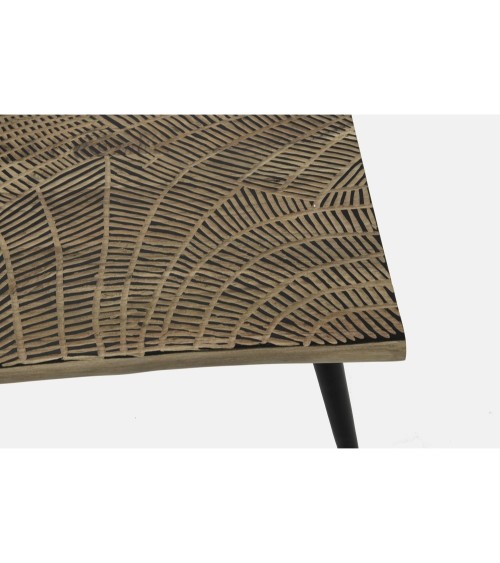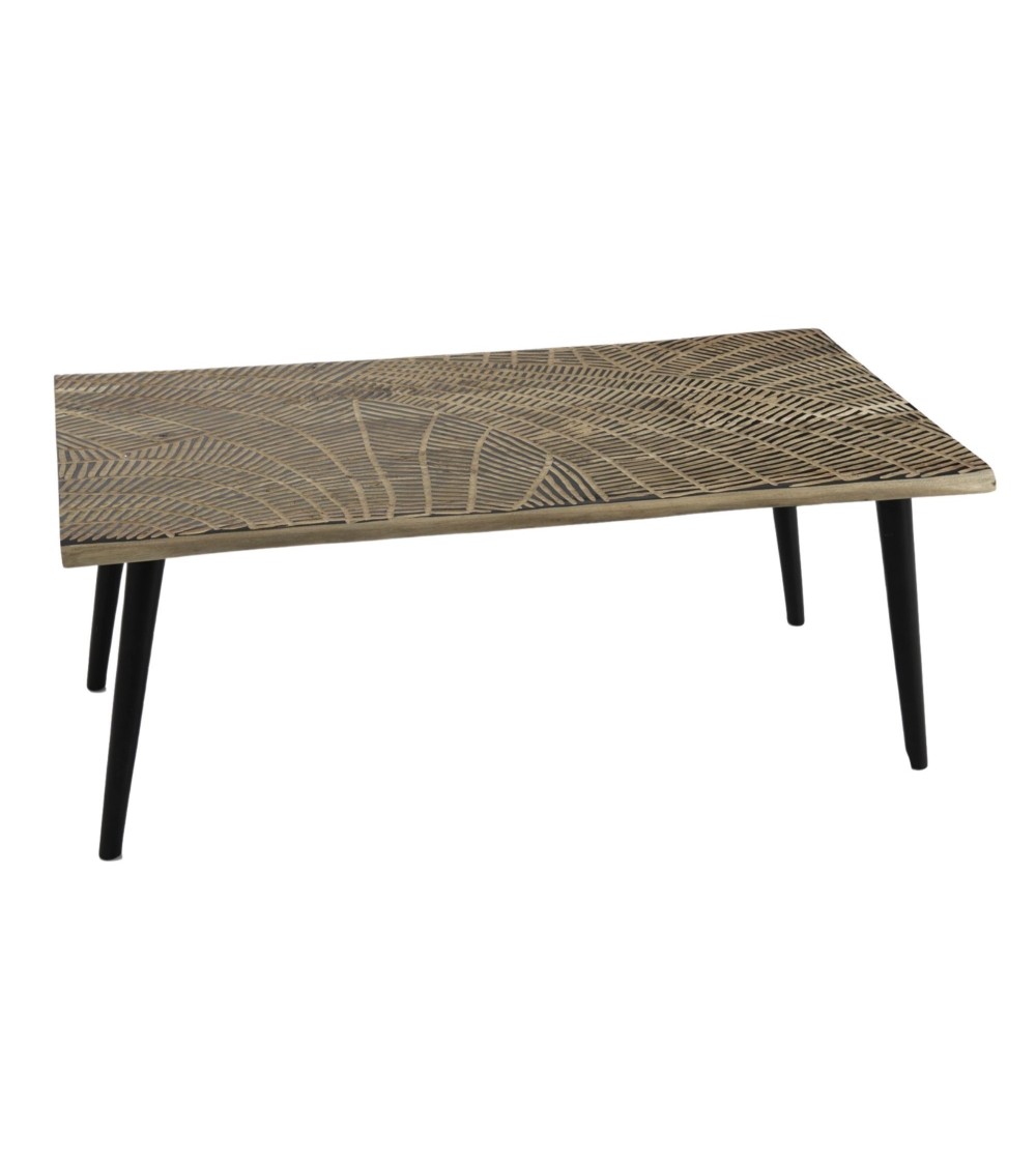 Donnez une atmosphère ethnique à votre salon avec cette table basse aux accents Africain. Dans la tendance déco actuelle, ce mobilier tribale envahit nos magasines et vous plonge dans une atmosphère mystérieuse et envoutante.Le plateau sculpté à la main et au décors contrasté, repose sur 4 pieds métal fuselés. Description technique : Dimensions : L 110 x P 60 x H 45 cmMatières : bois et métalPoids : 20 Kg...