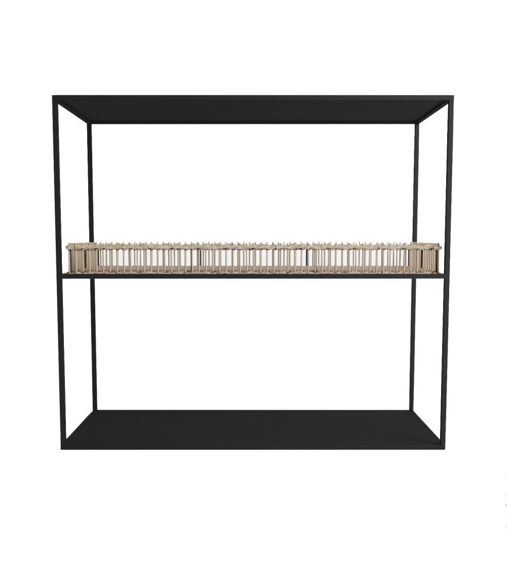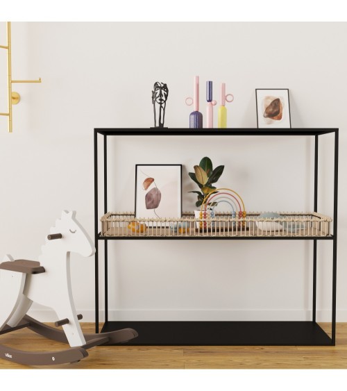 Console design en métal noir et bambou, LazareUn format parfait, une silhouette aux lignes nettes, un mélange des matériaux plein de caractère, cest décidément un trio gagnant pour la console design Lazare. Idéale à intégrer pour son côté fonctionnel autant que pour enrichir votre décoration intérieure, cette table de console en métal noir et étagère en bambou trouvera sa place dans toutes les pièces de la maison.Structure en métal noirÉtagères en métal noir ou bambouHauteur : 85 cmLongueur : 100 cmLargeur : 30 cmBelle et fonctionnelle, la console design Lazare?!Les proportions de la console en métal et bambou?Lazare font de cette étagère de rangement contemporaine lauxiliaire idéale des agencements malins. Avec une longueur suffisante pour habiller un mur sans le surcharger, mais finalement peu demandeuse despace, la table console noire offre une vraie capacité pour accueillir livres, albums photo, collections. Vous lapprécierez pour son look aux lignes pures et modernes, réchauffé par la présence du bambou. Elle se donne à voir par elle-même, comme une console design de belle facture, qui sexpose tout en exposant vos objets décoratifs, un vase, une statue animale, une lampe en porcelaine. Flanquée de 2 fauteuils, elle rayonne.La console design métal et bambou, latout charme et décoAvec ses 3 plateaux, la console design Lazare présente un côté multifonctions qui en ravira plus dun. En table console de style industriel, près de la table de la salle à manger, elle simplifie le service?; elle forme un ensemble au charme bohème dans le salon, rangement et déco, avec ses presque surs jumelles la sellette ou la table dappoint Lazare?; son plateau supérieur réceptionne courrier, clés, plateau vide-poches dans l'entrée ou le couloir?; et dans la chambre des enfants, elle fait office détagère pour les boîtes à trésors, et de console design pour une lampe veilleuse, une figurine décorative.