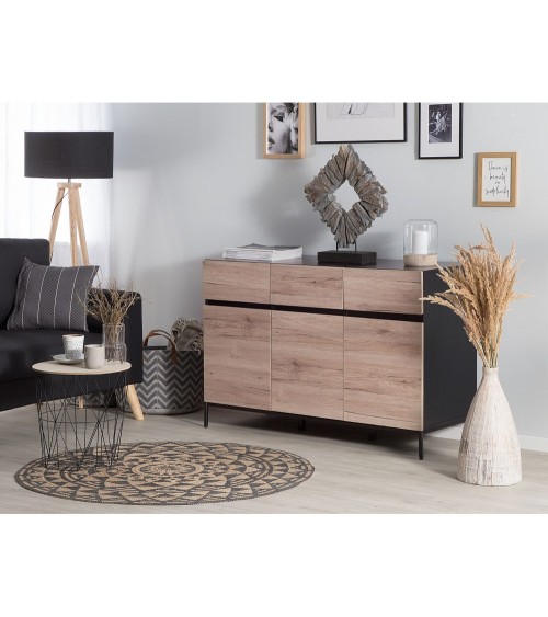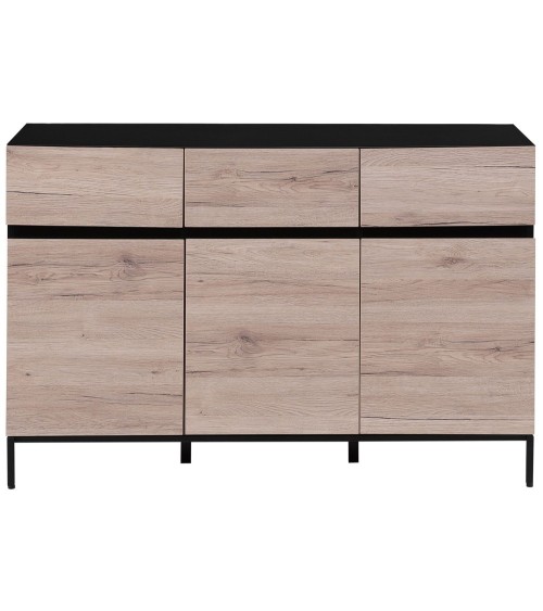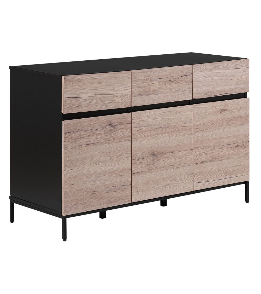 Donnez une touche de modernité à votre salon avec ce magnifique buffet. Doté de trois tiroirs et de deux armoires trois portes, il offre un vaste espace de rangement pour satisfaire tous vos besoins à cet égard. La fonctionnalité est complétée par un superbe aspect en bois clair combinés avec un cadre en métal enduit de poudre noire.