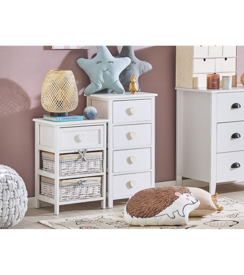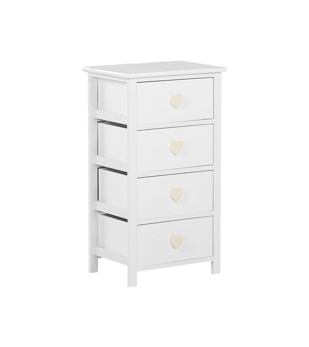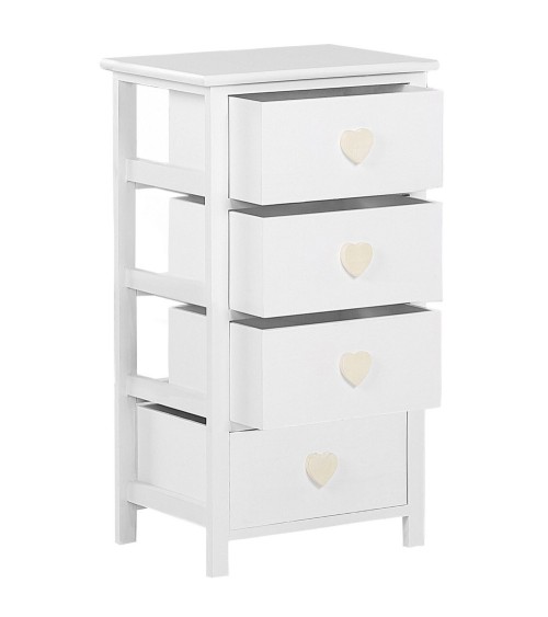 Un intérieur bien rangé et bien organisé est un intérieur dans lequel on se sent toujours bien. Ce joli chiffonnier blanc sera un ajout idéal à une chambre à coucher scandinave, un couloir proveçal ou une chambre d'enfant cosy. Fabriquée en bois de paulownia et MDF de qualité, cette petite commode combine le style accrocheur à la fonctionnalité. Les 4 tiroirs offrent beaucoup d'espace pour ranger tous vos petits objets quotidiens ou jouets de votre enfant, tandis que les poignées en forme de cur lui ajoutent un côté romantique charmant. Un joli petit meuble de rangement qui saura se faire apprécier.