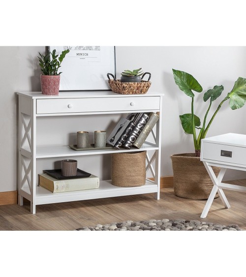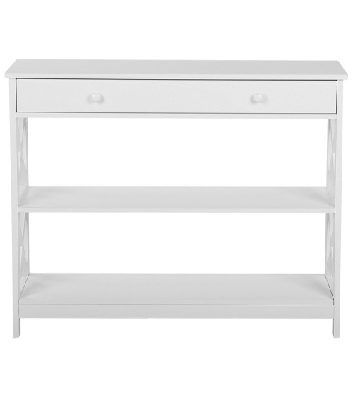 Console blanche du style moderne. Cette table console blanche du style moderne rehaussera un look de votre couloir ou de toute autre pièce. Grâce à ses dimensions compactes, la console peut être utilisée comme espace de stockage, tout en vous offrant une surface de décoration supplémentaire pour des bougies, des vases et des bibelots. En plus, deux tiroirs spacieux vous permettront de ranger parfaitement vos affaires même dans un petit appartement. Détails: Type de produit: Table d'entrée Style: Scandinave Couleur principale: Blanc Type de matière: Bois d'ingénierie Matière principale: MDF Matière du piétement: Bois d'ingénierie Matière du plateau: Bois d'ingénierie Tiroirs: Oui Finition: Peint Nombre de tiroirs: 1 Étagères: Oui Dimensions: Profondeur: 30 cm Largeur: 100 cm Hauteur: 80 cm Poids: 20 kg Charge admise du plateau: 10 kg L`offre inclue: 1 x Console Caractéristiques clés: Doté de différents types d'espace de stockage, Style minimaliste, Solution parfaite pour la chambre et le salon, Matières robustes faciles à entretenir, Structure stable et durable Informations d`assemblage: À assembler entièrement. 20 - 40 min Conseils de maintenance: MDF: 1.Nettoyez avec un chiffon et un détergent doux. Essuyez bien après le nettoyage.