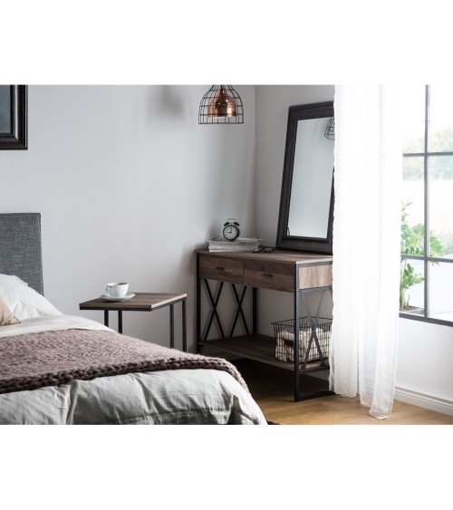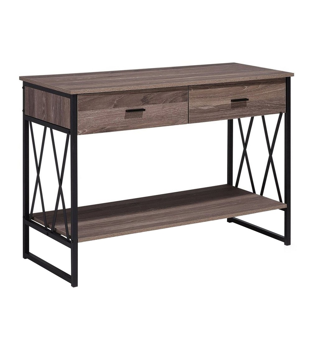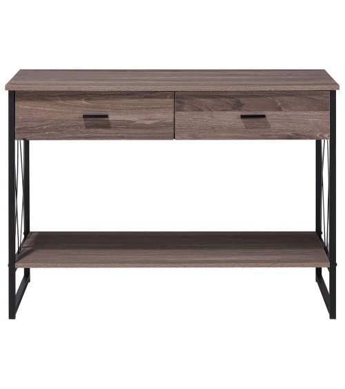 Commode, Meuble TV, Bureau, ... Ce mobilier trouvera toujours sa place là où vous le désirez ! Il se compose de deux tiroirs et d'une étagère inférieure à quelques centimètres du sol. Vous aurez ainsi assez d'espace de stockage pour vos papiers, clés et autres objets. La structure est en métal revêtu de poudre antioxydante peinte en noire. Les surfaces planes sont en couleur bois foncé et taupe s'accordant avec tout style de décoration, grâce à son grain élégant. Pratique et décoratif, il ne tient qu'à vous de choisir son emplacement !