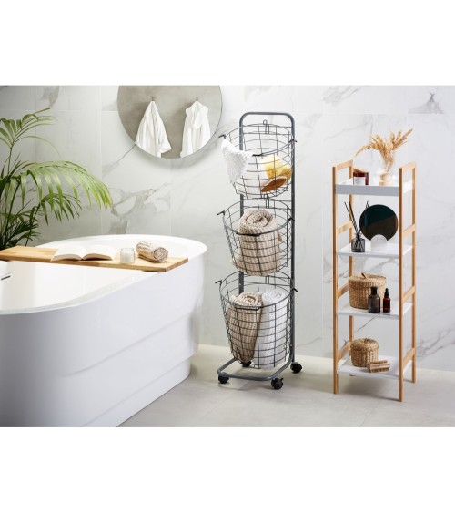 Étagère de salle de bain ou cuisine avec roulettes et 3 paniers amovibles. Cette étagère à paniers en métal noir s'avèrera vite indispensable pour garder votre maison ou appartement bien organisé et sans encombrement. Légère et facile à transporter, grâce aux roulettes pratiques, elle est un accessoire de rangement parfait pour votre salle de bain ou cuisine. Les 3 corbeilles amovibles peuvent servir comme paniers à linge ou serviettes, mais aussi à fruits et légumes. Les 3 paniers peuvent être facilement détachés du support et utilisés séparément. Côté style, cette étagère sera un ajout idéal à tous les intérieurs modernes, industriels et scandinaves.Détails: Type de produit: Petite armoire de bain Style: Moderne Couleur principale: Gris Type de matière: Métal Matière principale: Métal Matière secondaire: Matière synthétique Finition: Revêtu de poudre Dimensions: Profondeur: 37 cm Largeur: 37 cm Hauteur: 123 cm Poids: 4 kg L`offre inclue: Décorations non incluses, 3 x Corbeille en métal, 1 x Support Caractéristiques clés: Facilement transportable grâce à ses roulettes pivotantes, Style intemporel, Matériau léger et robuste, Multifonctionnel, Grand espace de stockage Informations d`assemblage: À assembler entièrement. 5 - 15 min Conseils de maintenance: Métal: 1.Pour les éléments en cuivre ou chromés, utilisez un produit de polissage spécial 2.Pour éviter les rayures, n'utilisez pas de nettoyants abrasifs 3. Nettoyez avec un chiffon et un détergent doux, essuyez bien ensuite.