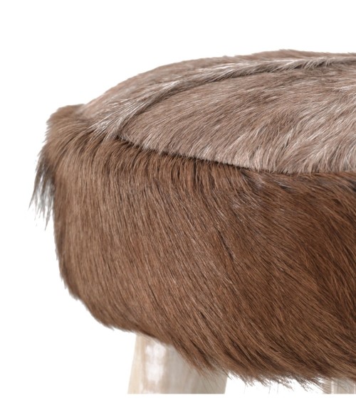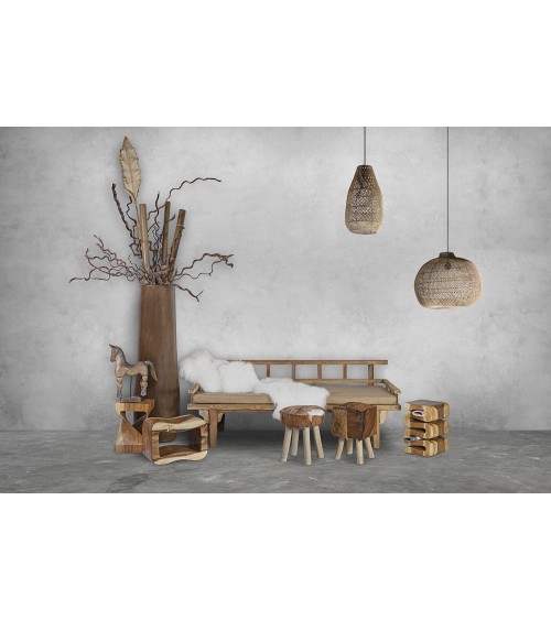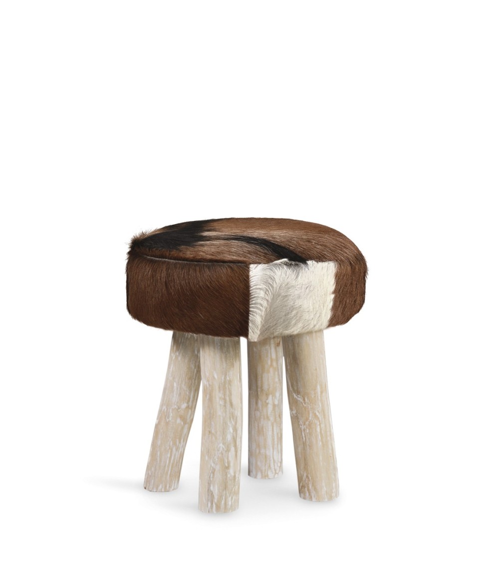 Tabouret fabriqué en bois de teck beige et cuir naturel de chèvre. Ce produit est unique et fabriqué avec matières naturelles, il peut présenter des variations de couleur et forme par rapport à la photo. Aucun assemblage nécessaire.