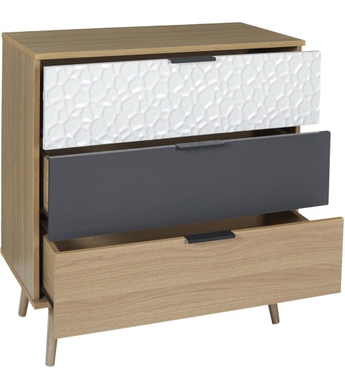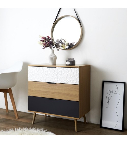 La très pratique commode 3 tiroirs Sven est un meuble de rangement moderne qui ajoutera à la décoration de votre intérieur tout en étant très fonctionnel et pourvu d'une belle capacité de rangement.Informations sur la commode 3 tiroirs Sven :Couleur : bois naturel, blanc, grisDimensions : L. 80 x P. 39 x H. 75 cmPoids : 27 kgComposition : bois, pin, panneau de particulesA monter soi-même