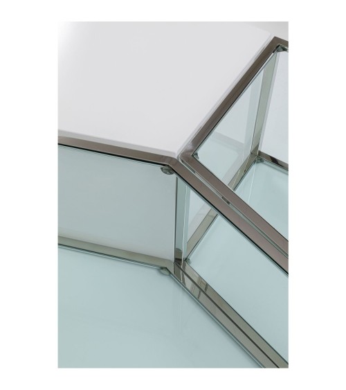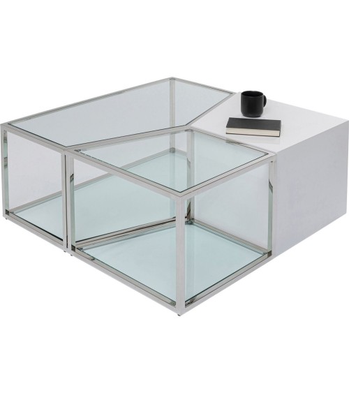 Cette table basse carrée trouve sa place dans un intérieur épuré et moderne. Elle est composée de trois blocs : deux en acier inoxydable avec des plateaux en verre et un blanc en bois compressé. Elle peut donc se diviser entre vos convives pour faciliter vos apéros et mettre à portée de chacun des plats. Capacité de charge maximale : 50 kg. Livrée partiellement démontée. Entretien : Utilisez une éponge humide avec, si besoin, un peu de liquide vaisselle puis passez un chiffon doux. Les surfaces en verre se nettoient très bien avec un nettoyant à vitres : pulvérisez simplement celui-ci sur la surface et essuyez avec un chiffon doux ou de l'essuie-tout absorbant. Ne nettoyez pas avec des tissus rugueux qui risquent de rayer le verre.