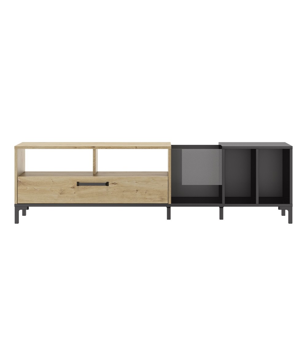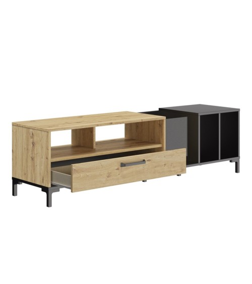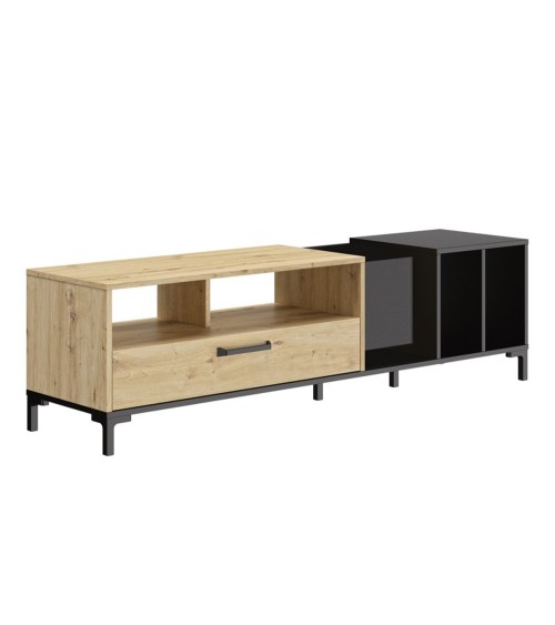 Meuble TV et Vinyle 190cm Diagone Arguin noir et bois Marque: Diagone - FABRICATION FRANÇAISE - Matériaux : Panneaux de particules - Poignée en métal laquée noir - Pieds en ABS noir - Couleurs : Noir et bois façon Chêne Artisan - Style industiel - Grand meuble TV 190 cm de long - Du côté gauche un meuble TV : - Pouvant accueillir un écran de 50 pouces (vendu séparément) - 2 niches de rangement pouvant accueillir une barre de son devant - 1 grand tiroir - Du côté droit un meuble vinyle : - 2 zones de rangement sous la platine - 1 bac façon disquaire au centre - 1 façade en verre - Poids produit : 47,6 kg - Dimensions produit : 190 x 45 x 51 cm - Produits Diagone garanti 24 Mois. - Conditionnement : Produit Diagone livrée, à monter, avec notice incluse. - Livré sans platine, sans vinyle et sans télévision.