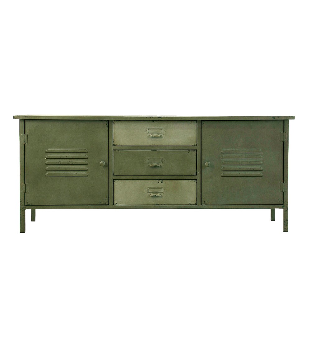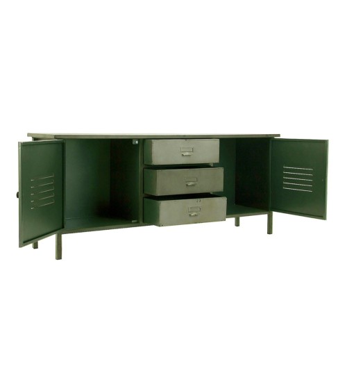Inspiré des anciens casiers industriels, le meuble TV Crieff est un clin dil à lère industrielle. Il est fabriqué en fer gris et noir formé par une structure simple dotée de trois tiroirs et deux portes latérales. Sa taille est de 120x30x51 cm et il sassortit parfaitement à d'autres meubles en bois et en métal dans le salon ou la salle à manger de votre maison.