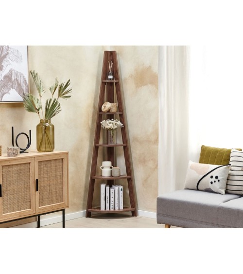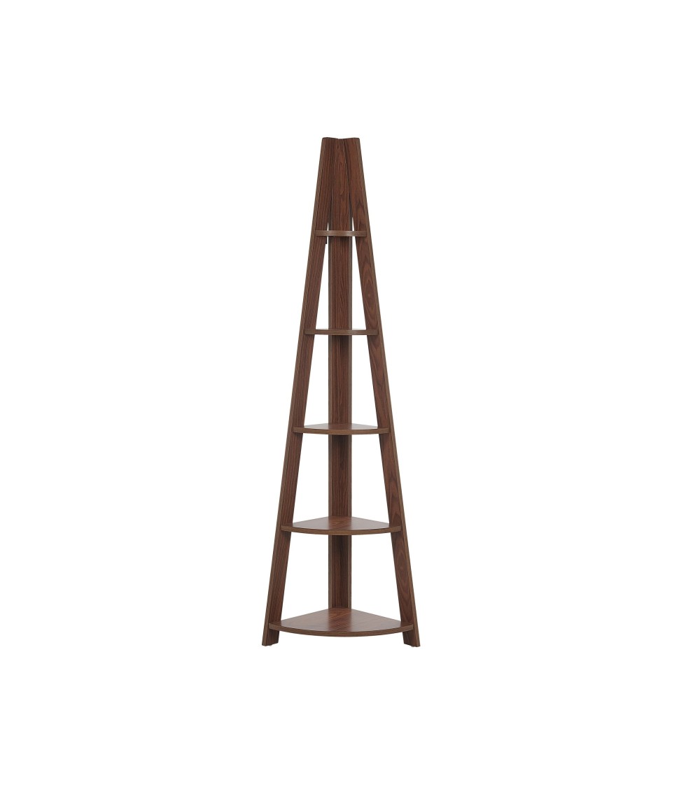 Étagère d'angle en MDF. Cette étagère au style intemporel en MDF de haute qualité, peut s'adapter à n'importe quel type de pièce et à n'importe quel style de décoration. Elle agrémentera parfaitement votre salon ou bureau pour ranger vos livres ou CDs. Elle se compose de 4 plateaux disposés en pyramide pour un large espace de stockage.Détails: Type de produit: Bibliothèque Style: Moderne Couleur principale: Bois foncé Type de matière: Bois d'ingénierie Matière principale: MDF Matière du piétement: Bois d'ingénierie Nombre d`étagères: 5 Finition: Mat Dimensions: Profondeur: 35 cm Largeur: 49 cm Hauteur: 175 cm Poids: 12 kg Charge maximum de l`étagère:: 3 kg L`offre inclue: 1 x Etagère Caractéristiques clés: Étagère pratique, parfaite pour entreposer des bibelots, S'adapte à différents types d'intérieurs, Finition effet bois pour un look naturel, De haute qualité, Facile à entretenir et extrêmement durable Informations d`assemblage: À assembler entièrement. 45 - 60 min Informations supplémentaires: Veuillez noter que pour des raisons de sécurité, le produit doit être fixé au mur. Les fixations nécessaires sont incluses dans l'offre. Conseils de maintenance: MDF: 1.Nettoyez avec un chiffon et un détergent doux. Essuyez bien après le nettoyage.