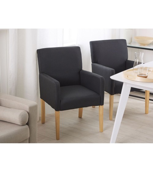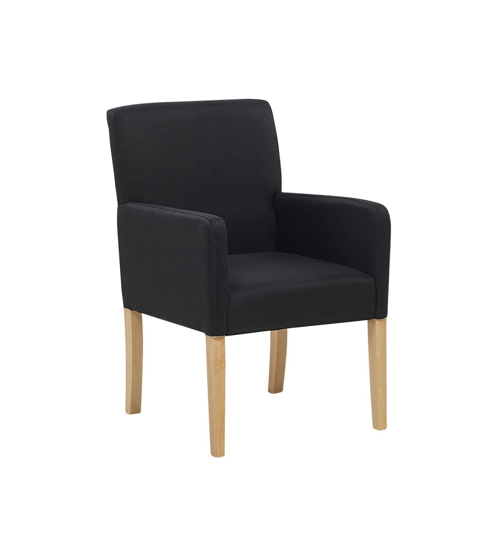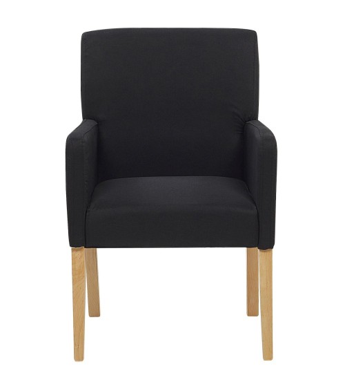Cette jolie chaise au look branché allie confort et esthétisme. Les pieds fins et stables en bois d'hévéa et le revêtement en tissu noir résistant, agréable au toucher et facile à entretenir, assurent un confort d'utilisation et d'assise optimal. Parfaitement adaptée pour servir comme chaise de salle à manger, bistrot ou restaurant, elle peut aussi trouver sa place dans votre salon. Grâce à ses accoudoirs ergonomiques et son rembourrage agréable, cette chaise est en effet un petit fauteuil idéal surtout pour les petits espaces. Sa silhouette rétro tendance fait de cette chaise - fauteuil un ajout sublime au décor scandinave et moderne.