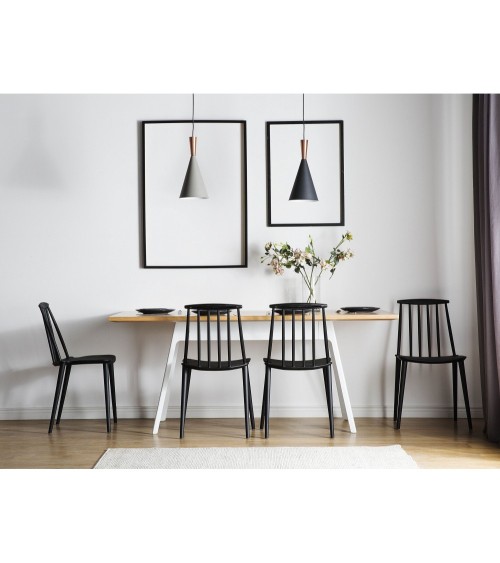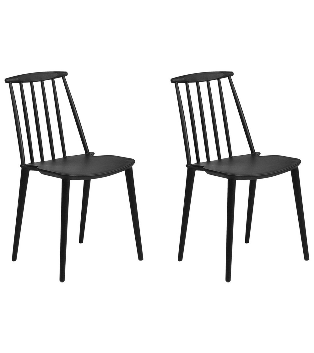 Lot de 2 chaises de salle à manger noires. Ce lot de 2 chaises à la fois classiqueset intemporelle s'adaptera à n'importe quel type de décoration. Grâce aux matériaux faciles d'entretien, il est idéal pour une utilisation en cuisine ou dans une salle à manger. Les chaises en plastique aux look frais et moderne, s'intègreront merveilleusement avec de nombreux styles d'ameublements différents. Un dossier haut avec des entretoises verticales minces fournit un soutien pour une assise sûre et confortable.Détails: Type de produit: Chaise de salle à manger Style: Rétro Couleur principale: Noir Type de matière: Matériaux synthétiques Matière principale: Matière synthétique Matière du piétement: Matériaux synthétiques Matière de l`assise: Matériaux synthétiques Accoudoirs: Non Finition: Mat Empilable: Oui Dimensions: Profondeur: 41 cm Hauteur du siège: 45 cm Largeur: 49 cm Hauteur: 83 cm Surface d`assise: 40x43 cm Poids: 5 kg Charge admise: 110 kg L`offre inclue: 2 x Chaise Caractéristiques clés: Convient dans une salle à manger, une cuisine ou un bar, Un style simple s'adaptant à tout type d'intérieur, Matières robustes faciles à entretenir, Une conception solide et une excellente finition, Prend peu d'espace, empilable, Patins pour le pieds assurent la protection contre les rayures Informations d`assemblage: Ne nécessite pas d'assemblage Conseils de maintenance: Matière synthétique: 1.Nettoyez avec un chiffon et un détergent doux, essuyez bien ensuite.