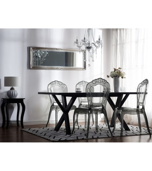 Le design classique associé à un matériau moderne ! La forme magnifiquement courbée des chaises, les jambes minces et lornementation caractéristique sur le dossier et sous les sièges rappellent des chaises classiques du passé. Au lieu de bois tapissé de velours épais ou de brocart, ces chaises à la mode sont faites de polycarbonate de haute qualité. Le matériau est résistant aux rayons UV, particulièrement robuste et facile à nettoyer. La couleur noire transparente, souligne une touche moderne et donne de la légèreté aux chaises empilables. Avec leur design inhabituel, elles créent des accents contrastés dans les styles de design dintérieurs modernes et classiques. Loffre comprend un lot de deux chaises.