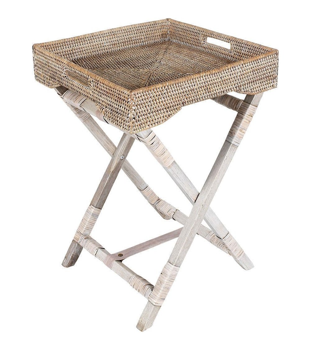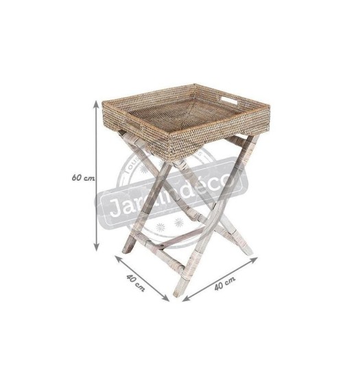 Aspect : Matériau principal : rotin patiné blancDimensions : Hauteur (en cm) : 60,00Longueur (en cm) : 40,00Profondeur (en cm) : 40,00Autres caractéristiques : Poids (en kg) : 2,50 Plateau sur pied pliant en rotin patiné blanc.