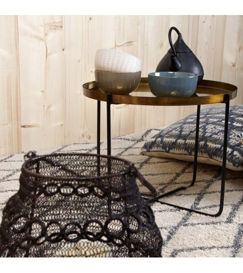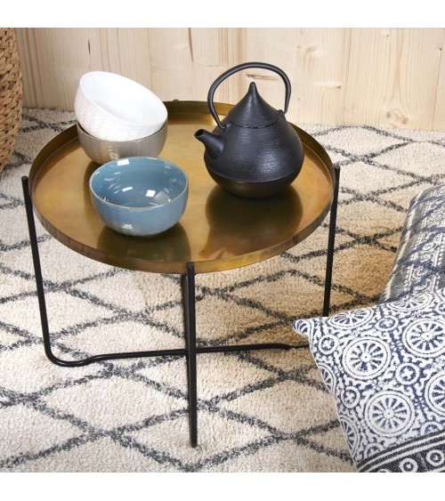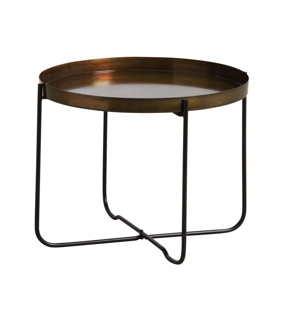 Aspect : Matériau principal : Métal doré vieilliPied : Métal noirDimensions : Diamètre (en cm) : 45,00Hauteur (en cm) : 35,00Autres caractéristiques : Pied pliable : Oui Table ronde avec plateau métal doré vieilli