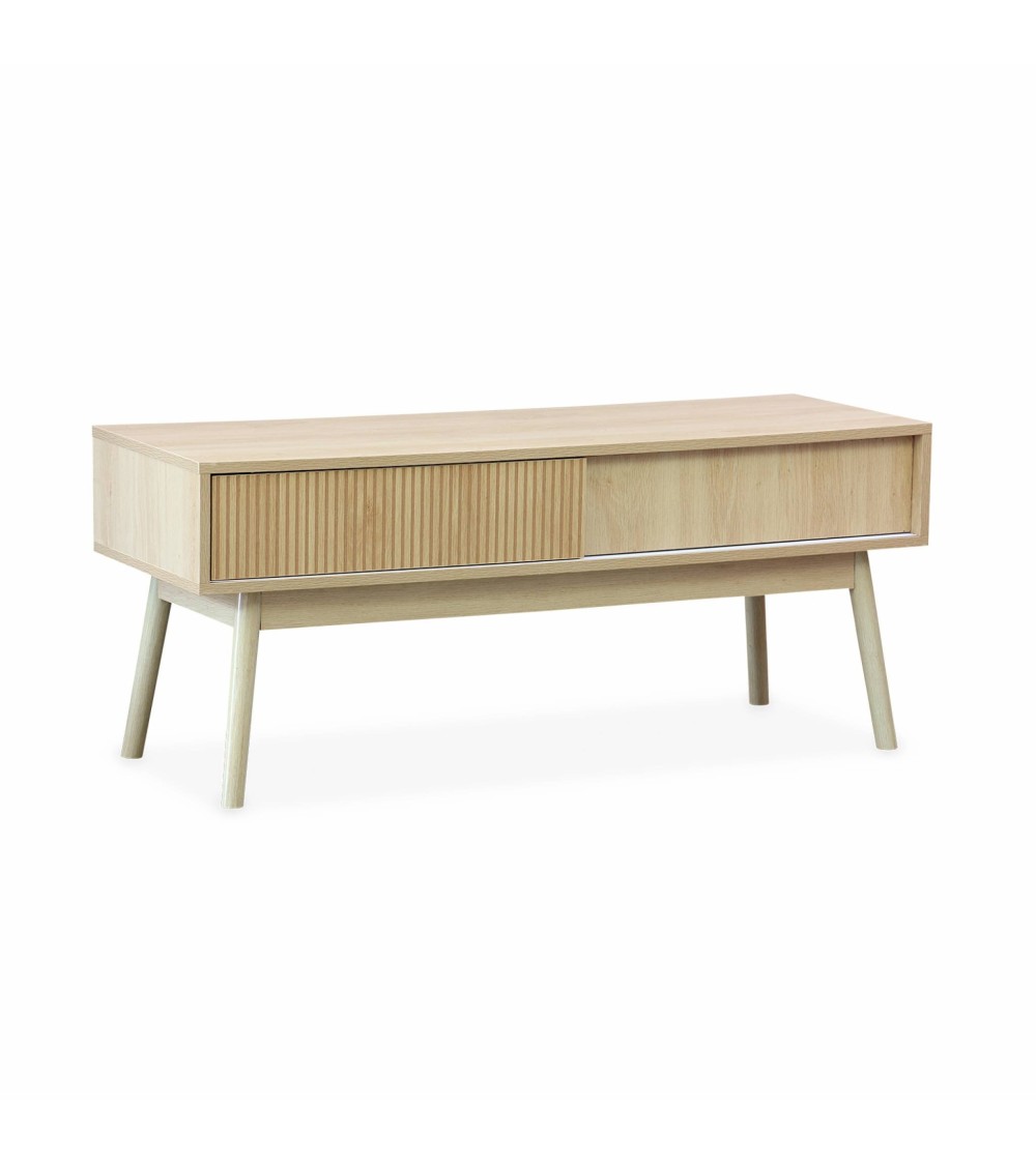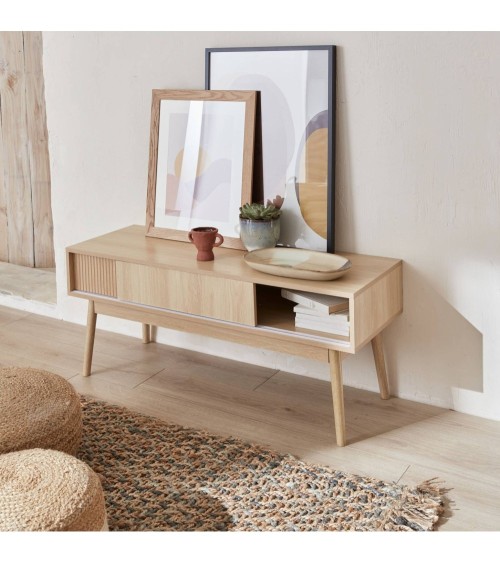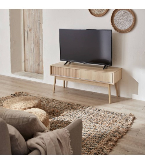 Les + ProduitPortes coulissantes1 trou passe-filPiètement pin massif 2 espaces de rangement La collection Linear invite le charme scandinave dans votre intérieur. Les pièces sont dotées de pieds évasés en pin massif, évoquant la décoration nordique très tendance. La couleur bois clair des meubles et leurs tiroirs striés apportent une touche d'authenticité. Table de chevet, console, bibliothèque, buffet, meuble TV... Cette collection vous propose une sélection de meubles élégants et épurés pour aménager au mieux votre intérieur. Le meuble TV de la gamme Linear apportera une touche sobre et épurée à votre pièce de vie. Sa structure en décor bois et sa porte en bois strié offrent un design élégant qui se fondera parfaitement dans votre décoration. Craquez pour son piètement en bois de pin qui ajoutera une touche scandinave à votre intérieur. Fonctionnel, il est équipé de 2 niches de rangement fermées par des portes coulissantes, qui vous permettront de ranger vos accessoires facilement. Son fond quant à lui est doté d'une ouverture, utile pour faire passer vos câbles électriques en toute discrétion.Un rangement esthétique et pratique ! CARACTERISTIQUES Couleur : décor bois Matière: Panneaux stratifiés Nombre de portes : 2 Nombre de pieds : 4 Piètement : pin massif Style: ScandinaveType: Meuble TV Usage : domestique uniquement Garantie : 2 ans DimensionsMeuble TV : L 115 x l 40 x H 48cmPlateau : L 115 x l 40cmPanneaux latéraux : L 40 x l 15cmPanneau de séparation : L 40 x l 15cmEpaisseur des panneaux : 1,5cmPortes : L 56,7 x l 14,2cmPieds : 3,8 x 3,8cmHauteur des pieds : 30cmPoids net : 16kgPoids max supporté : 20kg