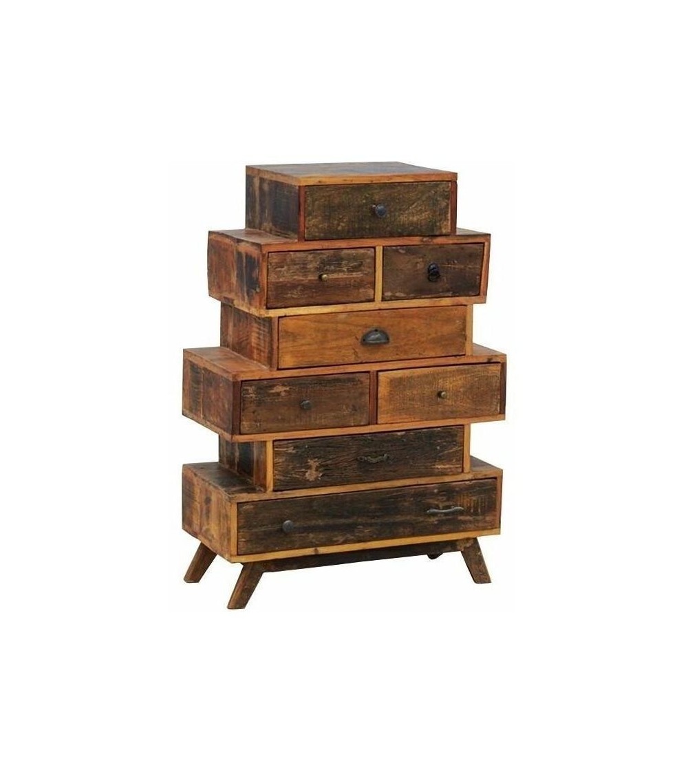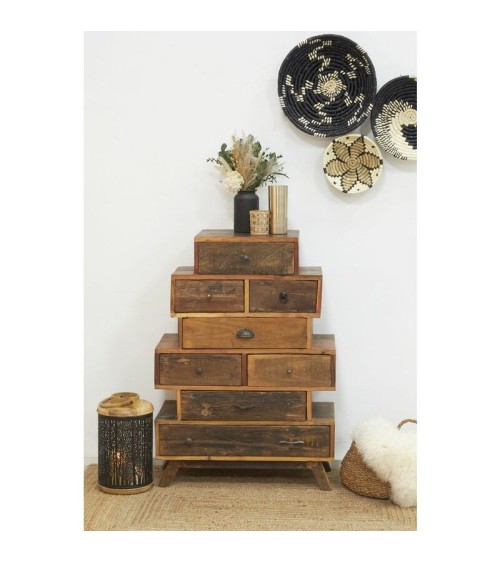 Aspect : Matériau principal : Bois recycléMatériaux secondaires : Poignées en métalDimensions : Hauteur (en cm) : 108,00Longueur (en cm) : 76,00Profondeur (en cm) : 35,00Autres caractéristiques : Livré monté : OuiPoids (en kg) : 73,50 Commode 8 tiroirs zigzag en bois recyclé, avec poignées en métal